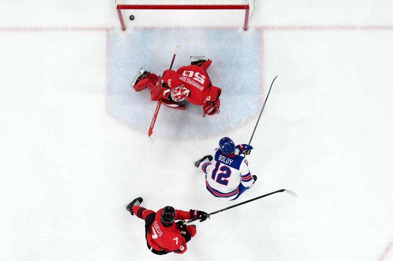 United States' Matt Boldy (12) scores his side's opening goal during a men's ice hockey gold medal game between Canada and the United States at the 2026 Winter Olympics, in Milan, Italy, Sunday, Feb. 22, 2026.