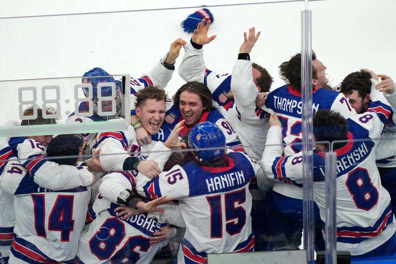United States celebrate after defeating Canada in a men's ice hockey gold medal game between Canada and the United States at the 2026 Winter Olympics, in Milan, Italy, Sunday, Feb. 22, 2026.