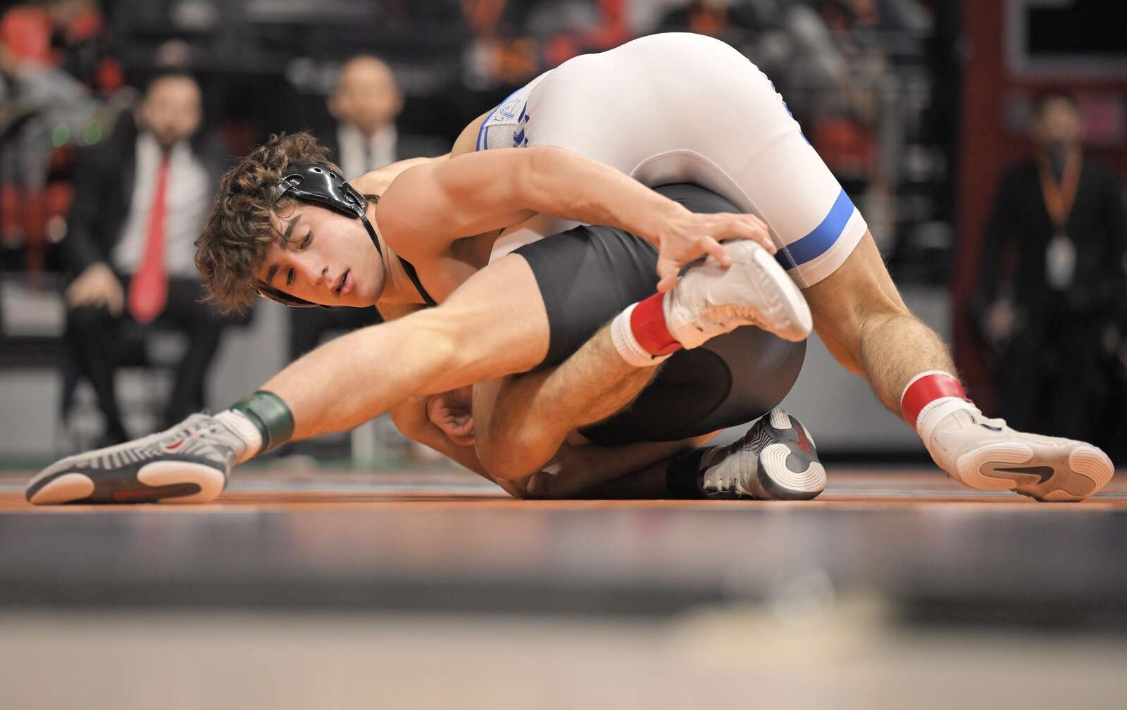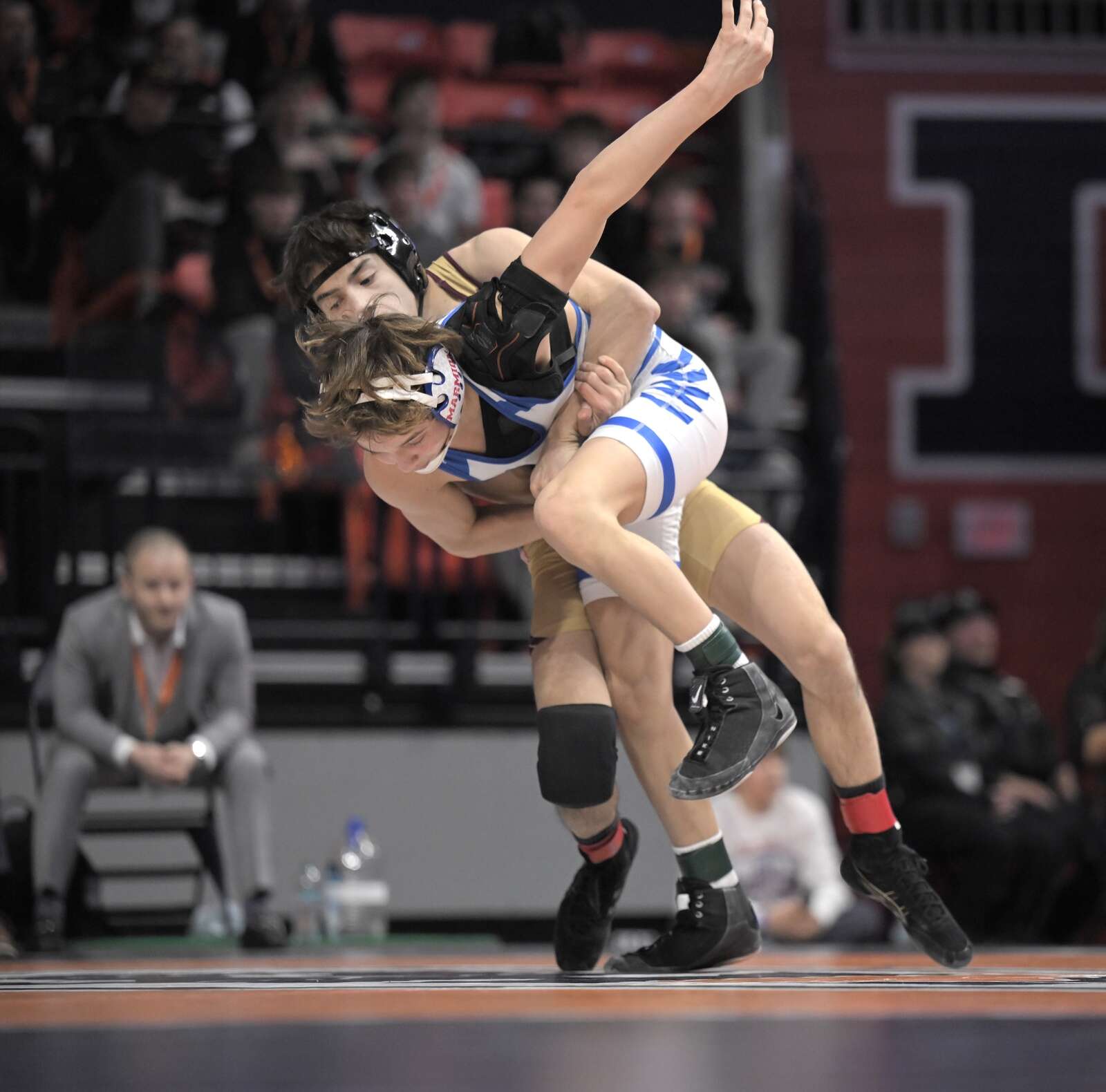 Marmion’s Demetrios Carrera wrestles Grant’s Vince Jasinski in the Class 3A 144-pound bout at the boys IHSA wrestling finals at State Farm Center in Champaign on Saturday, Feb. 21, 2026.