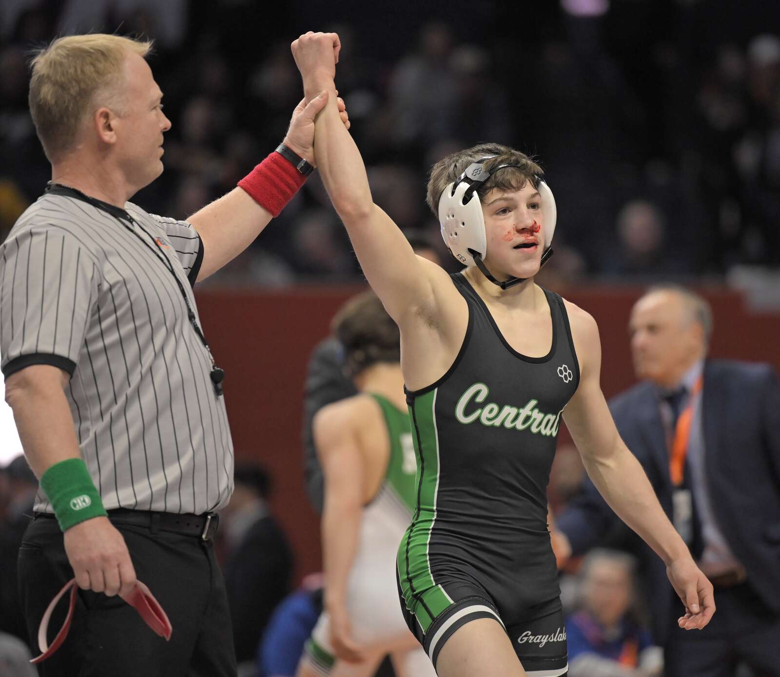 Grayslake Central’s Vince DeMarco is declared the champion of the Class 2A 113-pound match at the boys IHSA wrestling finals at State Farm Center in Champaign on Saturday, Feb. 21, 2026.