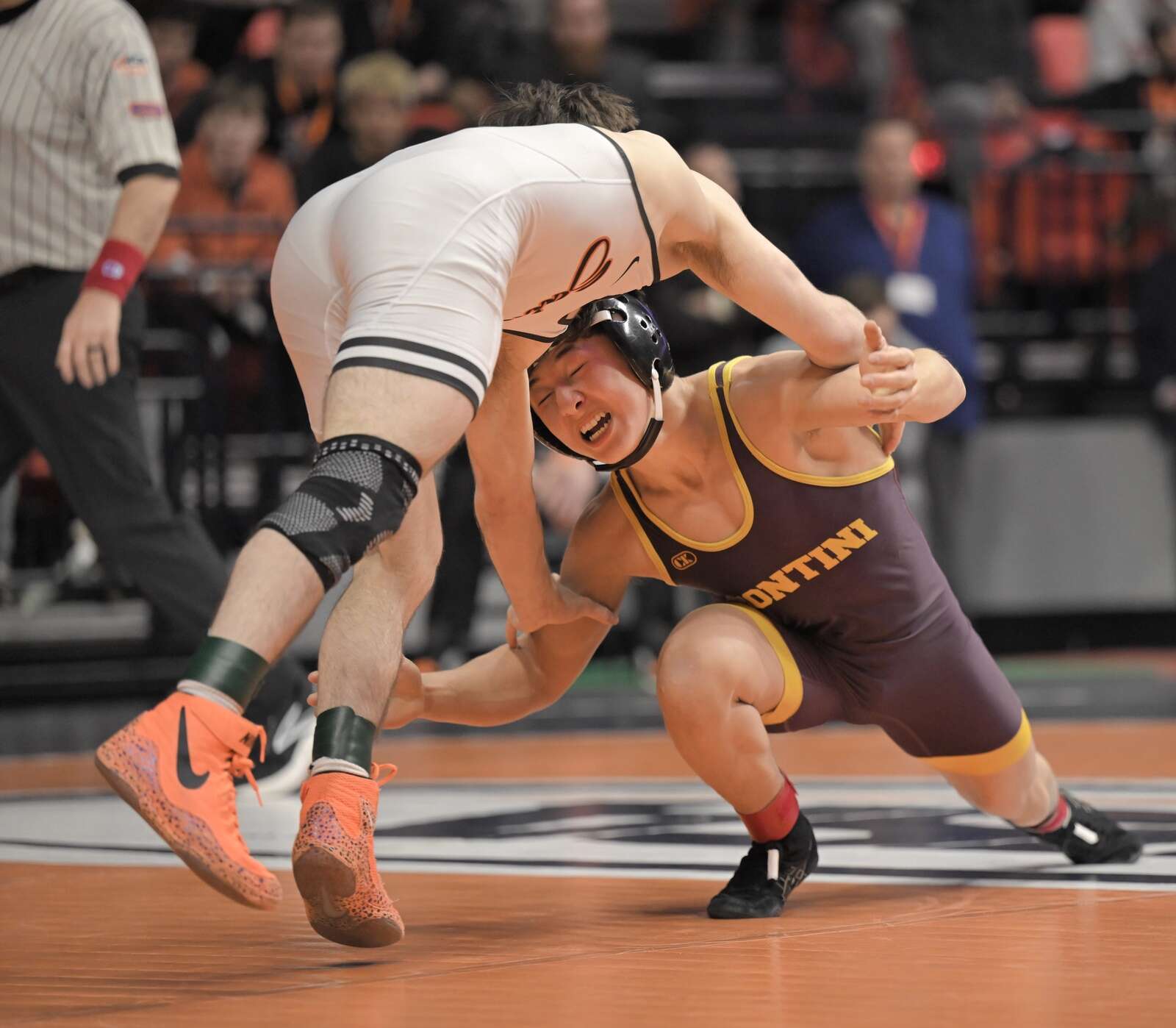 Montini’s Allen Woo shoots at St. Charles East’s Dom Munaretto in the Class 3A 120-pound bout at the boys IHSA wrestling finals at State Farm Center in Champaign on Saturday, Feb. 21, 2026.