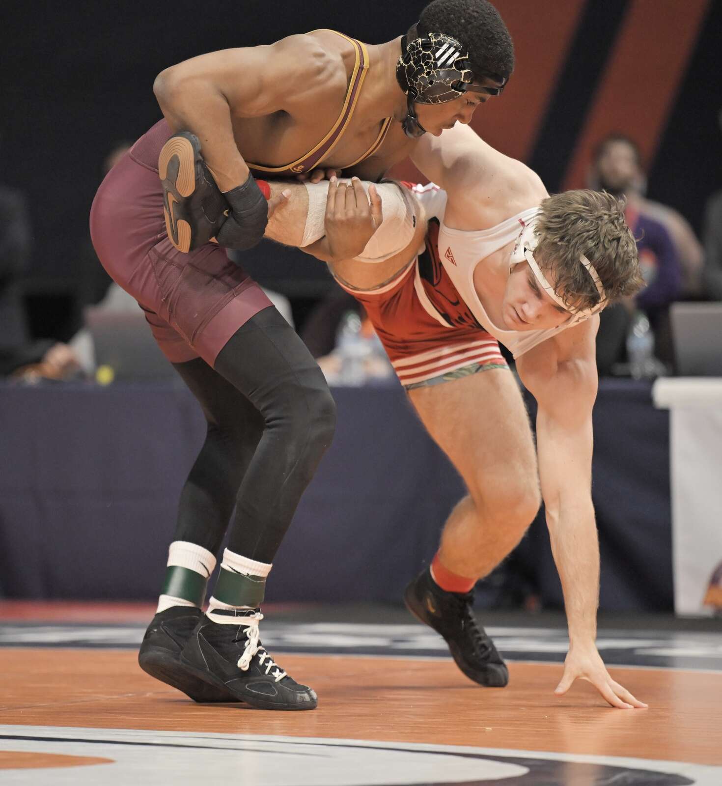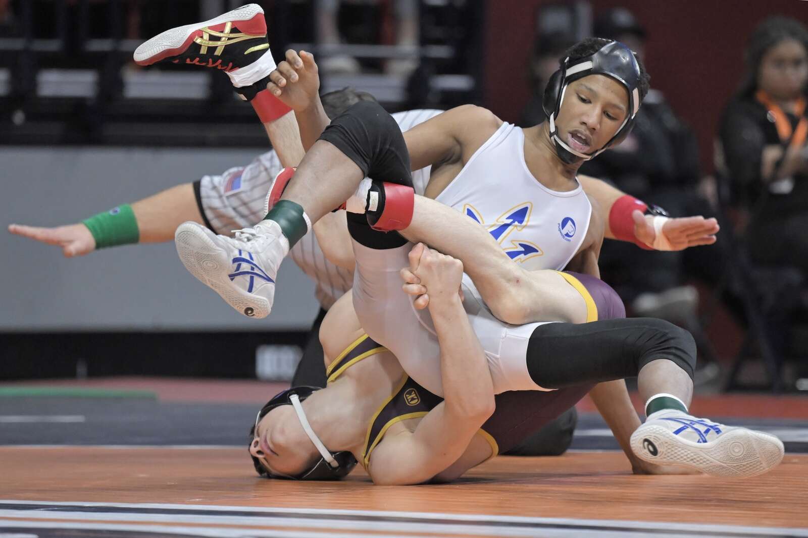 Hersey’s Oleksandr Havrylkiv faces Oak Park’s Jamiel Castleberry in the Class 3A 126-pound match at the boys IHSA wrestling finals at State Farm Center in Champaign on Saturday, Feb. 21, 2026.
