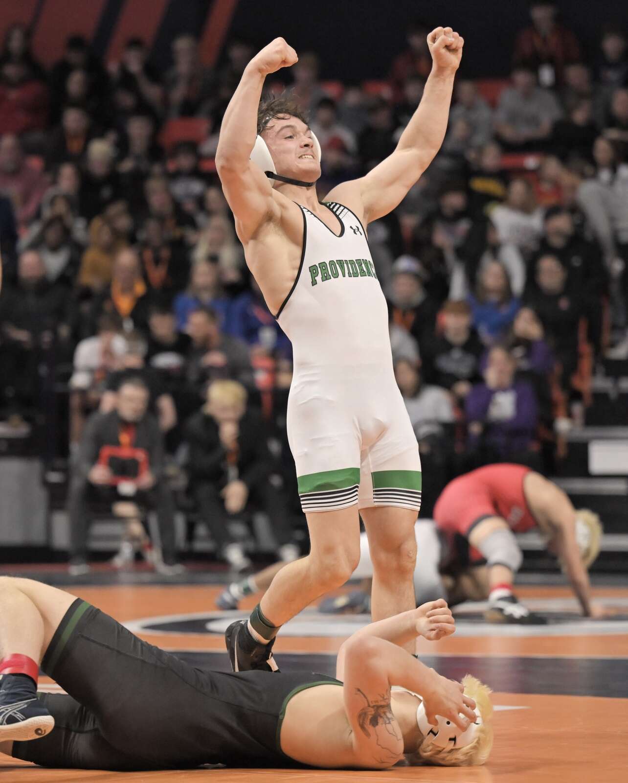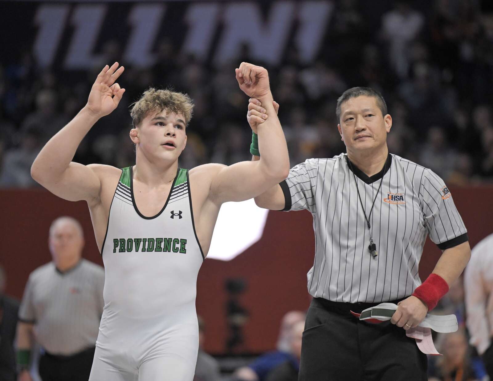 Providence Catholic’s Tommy Banas celebrates his win over Crystal Lake South’s Nathan Randle in the Class 2A 138-pound bout at the boys IHSA wrestling finals at State Farm Center in Champaign on Saturday, Feb. 21, 2026.