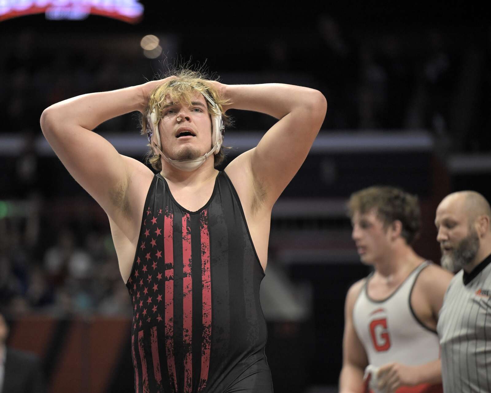 Woodstock Marian’s Jimmy Mastny is declared the winner in the Class 2A 215-pound bout at the boys IHSA wrestling finals at State Farm Center in Champaign on Saturday, Feb. 21, 2026.