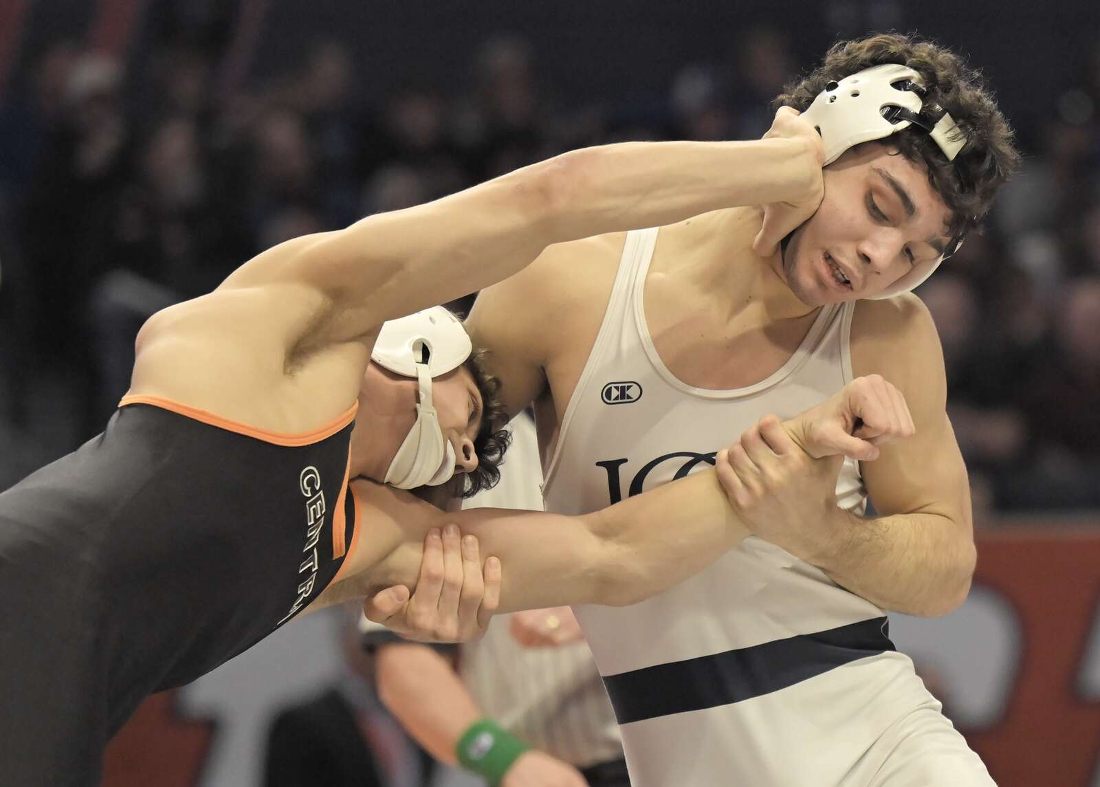 Frank Nitti, of IC Catholic, right, holds off Crystal Lake Central’s Nichlas Marchese in the Class 2A 144-pound bout at the boys IHSA wrestling finals at State Farm Center in Champaign on Saturday, Feb. 21, 2026.