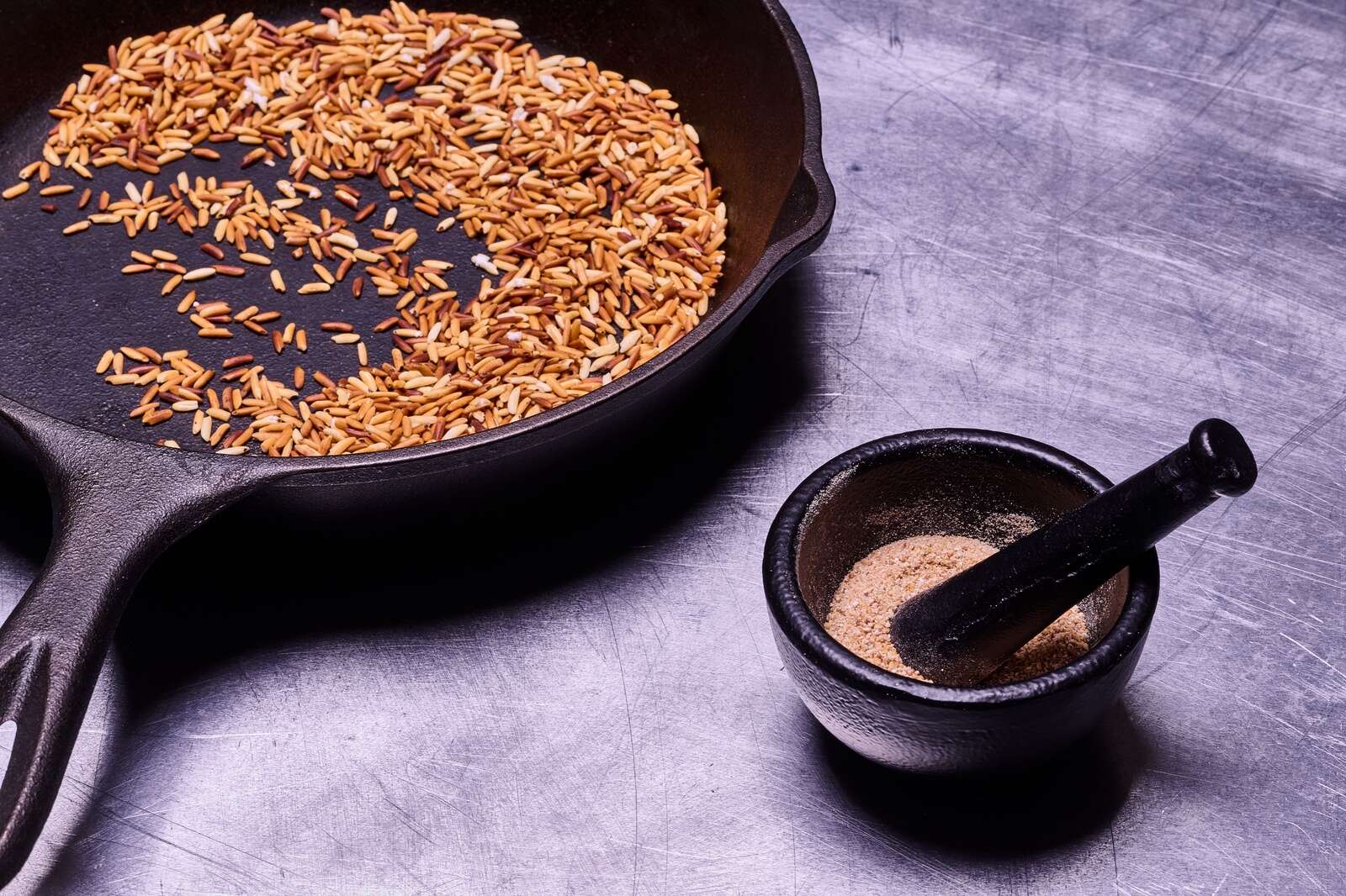 In a medium (10-inch) cast-iron skillet over medium heat, toast the rice, stirring occasionally, until it turns golden-to-dark-brown all over, about 5 minutes. Transfer the rice to a mortar and pestle, or a dedicated spice grinder, and grind until the rice turns to a fine powder.