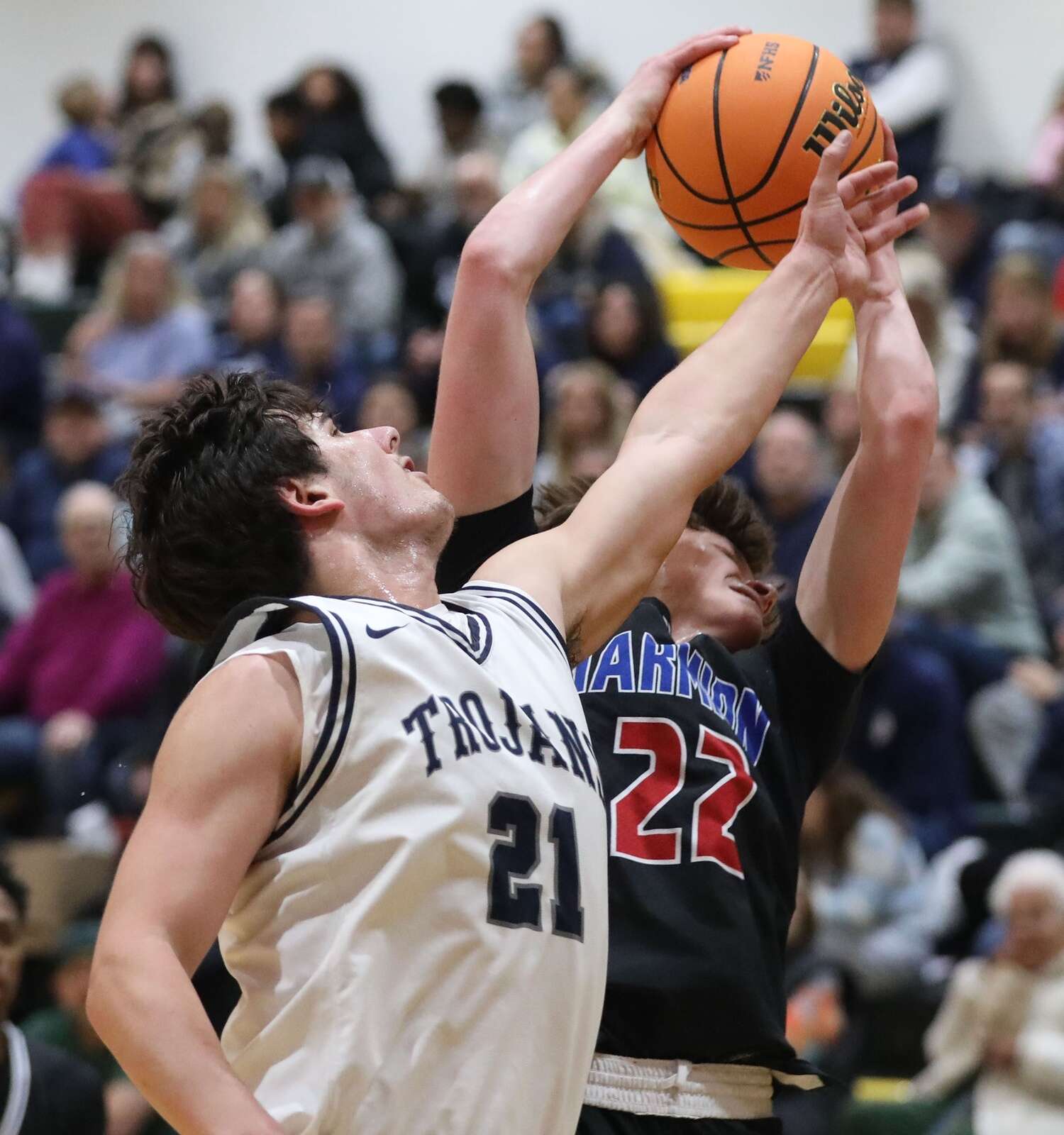 Brothers Adam, Brady and Evan Bauer combined for 19 points in helping the Trojans take a 38-19 lead into halftime.