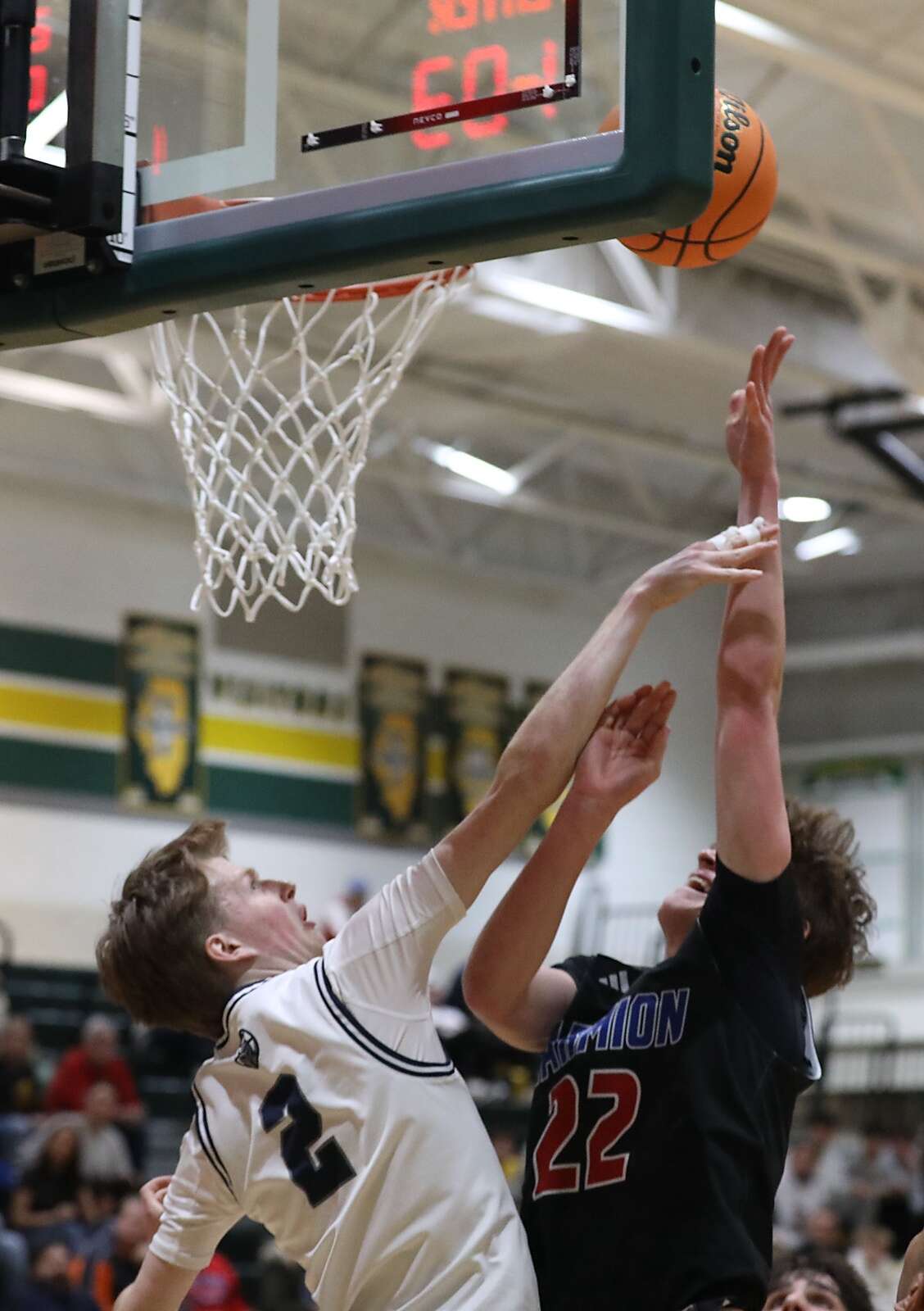 Cary-Grove's Brady Elbert battles with Marmion's Colin McEniry for a rebound during an IHSA Class 3A Crystal Lake South Regional boys basketball semifinal game on Wednesday, February, 25, 2026, at Crystal Lake South High School. Gregory Shaver — Shaw Media