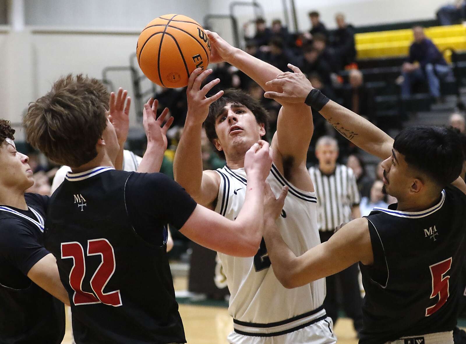 Cary-Grove's Brady Elbert (center) tries to grab a rebound between Marmion's Colin McEniry (left) and Ali Tharwani (right) during an IHSA Class 3A Crystal Lake South Regional boys basketball semifinal game on Wednesday, February, 25, 2026, at Crystal Lake South High School. Gregory Shaver — Shaw Media