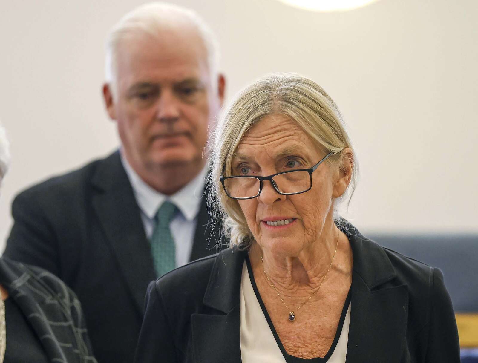 During a news conference Thursday, South Barrington Mayor Paula McCombie urged legislators to reject Gov. JB Pritzker’s proposed zoning reforms. Republican state Rep. Martin McLaughlin listens. Brian Hill/bhill@dailyherald.com