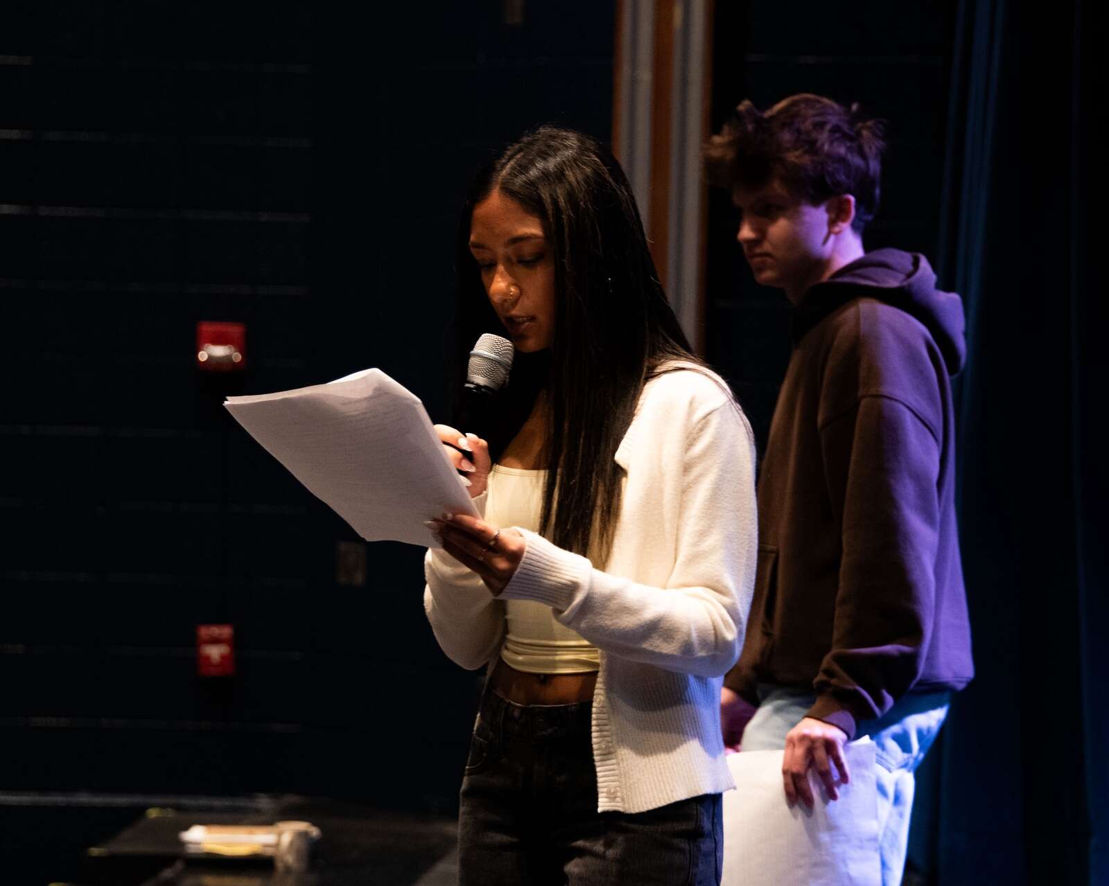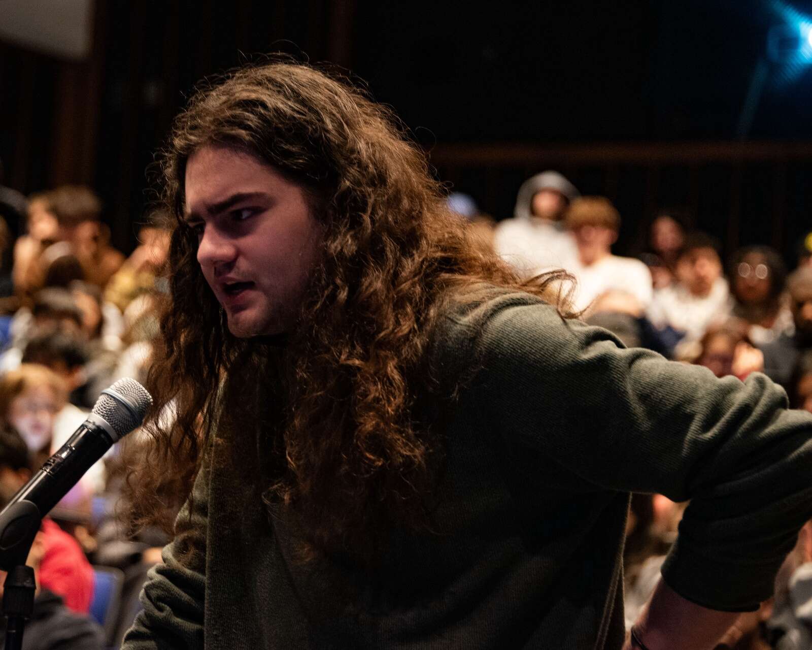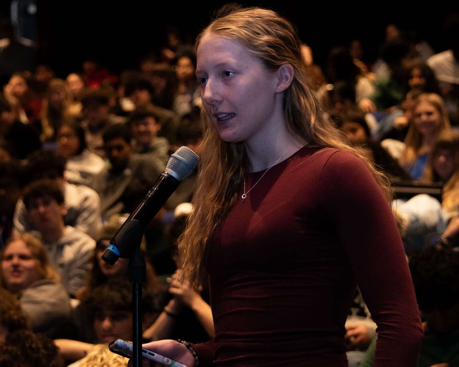 Student Kat Jenrick at the microphone for a question. Courtesy of District 211