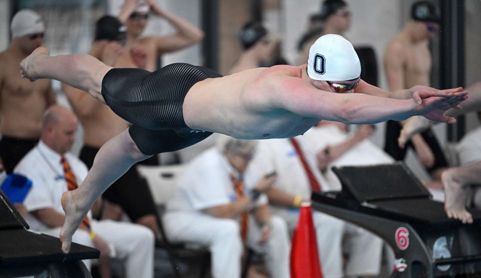 Oswego Coop’s Ethan Schrader leaves the starting block in the 200-yard freestyle relay during the boys state swimming and diving finals at the FMC Natatorium on Saturday, Feb. 28, 2026 in Westmont. Joe Lewnard/jlewnard@dailyherald.com