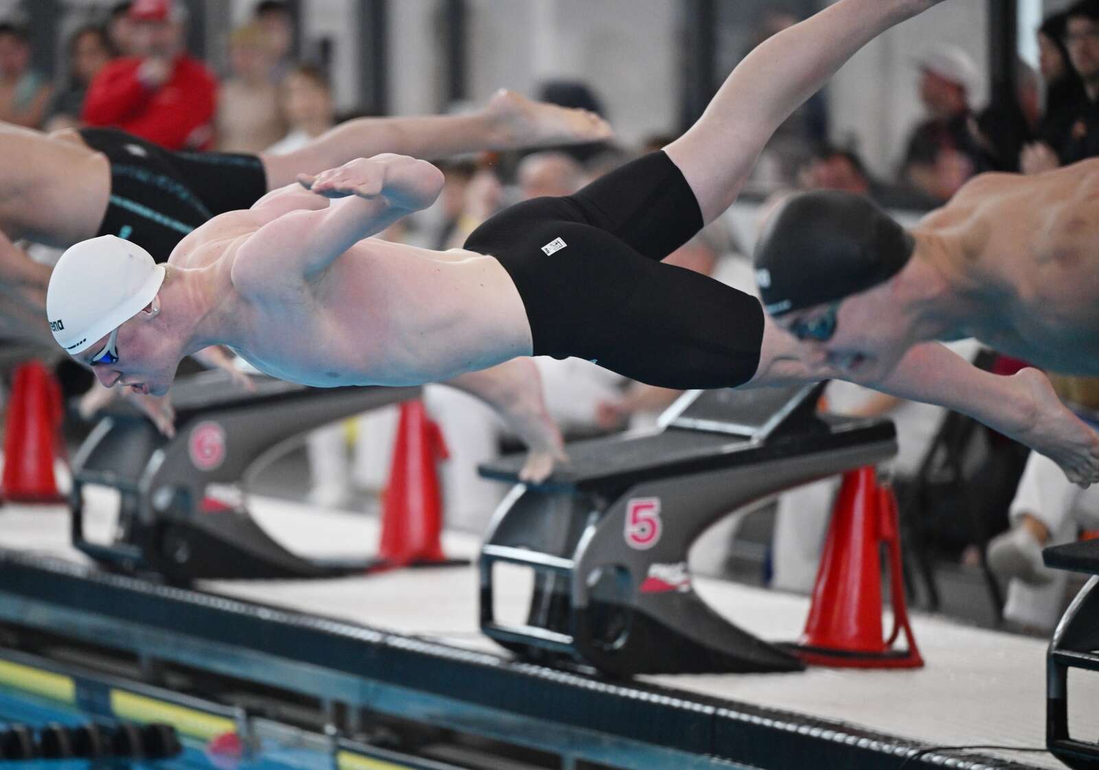 Oswego Coop’s Owen Lippoldt leaves the starting block in the 100-yard freestyle during the boys state swimming and diving finals at the FMC Natatorium on Saturday, Feb. 28, 2026 in Westmont. Joe Lewnard/jlewnard@dailyherald.com