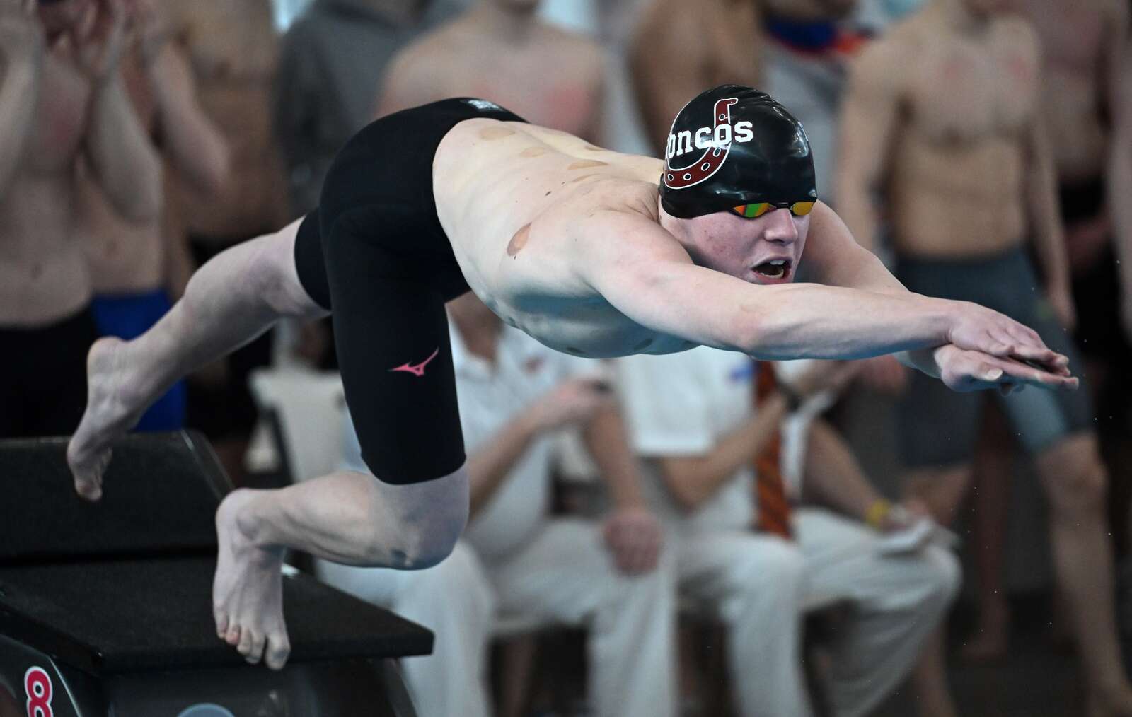 Marmion’s Braden Nagel leaves the starting block in the 400-yard freestyle relay during the boys state swimming and diving finals at the FMC Natatorium on Saturday, Feb. 28, 2026 in Westmont. Joe Lewnard/jlewnard@dailyherald.com