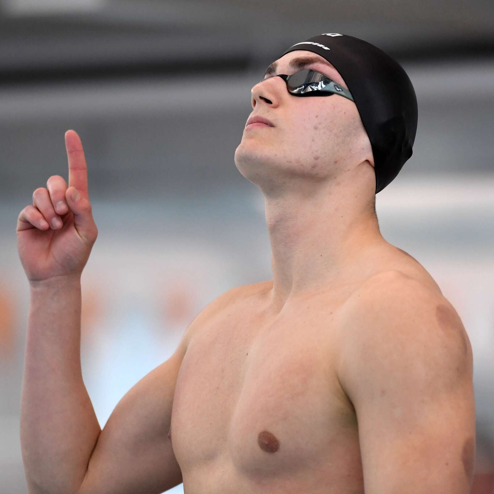 Hinsdale Central’s Luke Vatev points skyward during introductions for the 200-yard freestyle relay at the boys state swimming and diving finals at the FMC Natatorium on Saturday, Feb. 28, 2026 in Westmont. Joe Lewnard/jlewnard@dailyherald.com