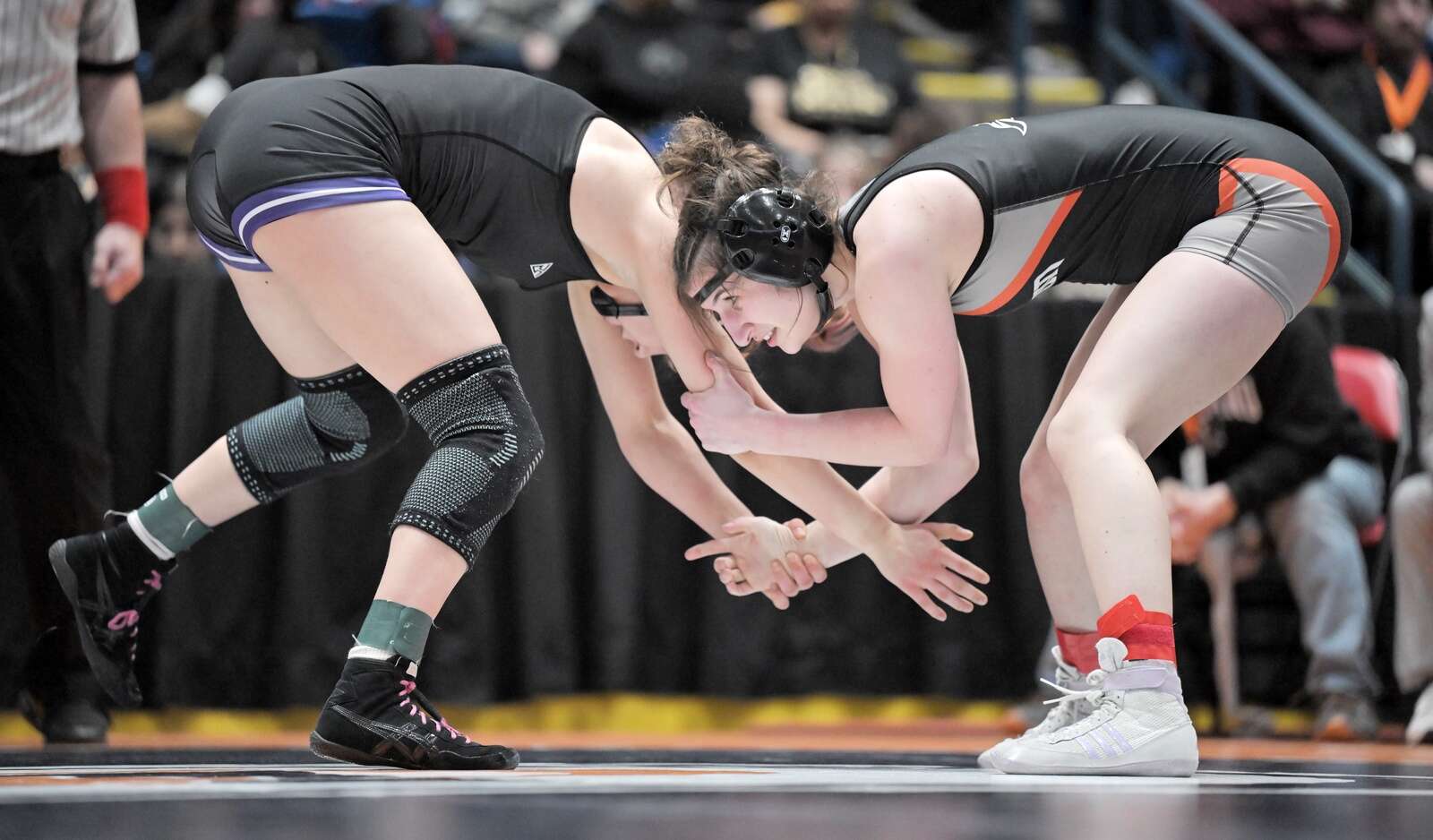 Saint Viator’s Charlotte Nold weats My Little Pony socks as she wrestles Glenbard East’s Nadiia Shymkiv wrestle in the 105-pound class at the girls wrestling state finals tournament at Grossinger Arena in Bloomington on Saturday, Feb. 28, 2026.