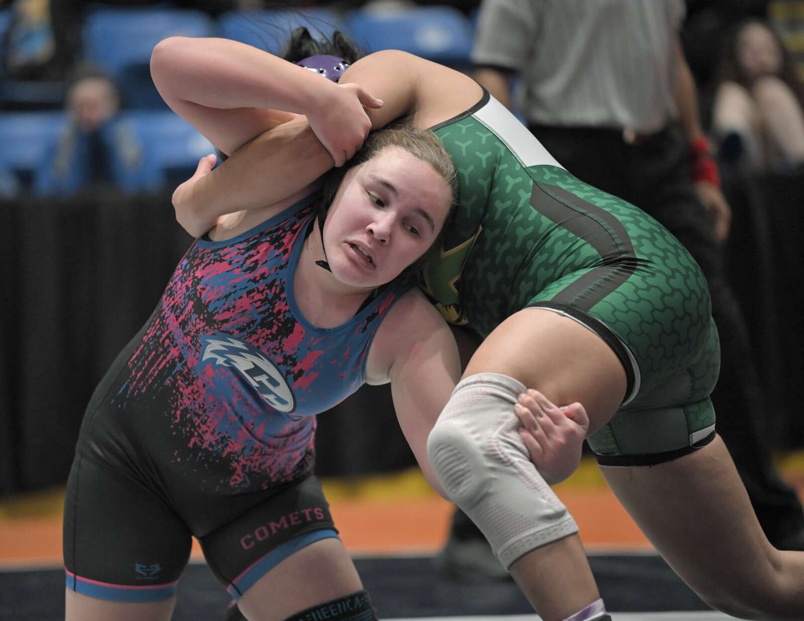 Lockport’s Claudia Heeney, left, controls Schaumburg’s Sharon Olorunfemi to her third consecutive championship, this year in the 135-pound class at the girls wrestling state finals tournament at Grossinger Arena in Bloomington on Saturday, Feb. 28, 2026.