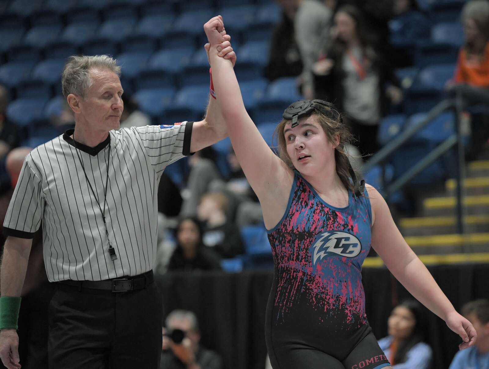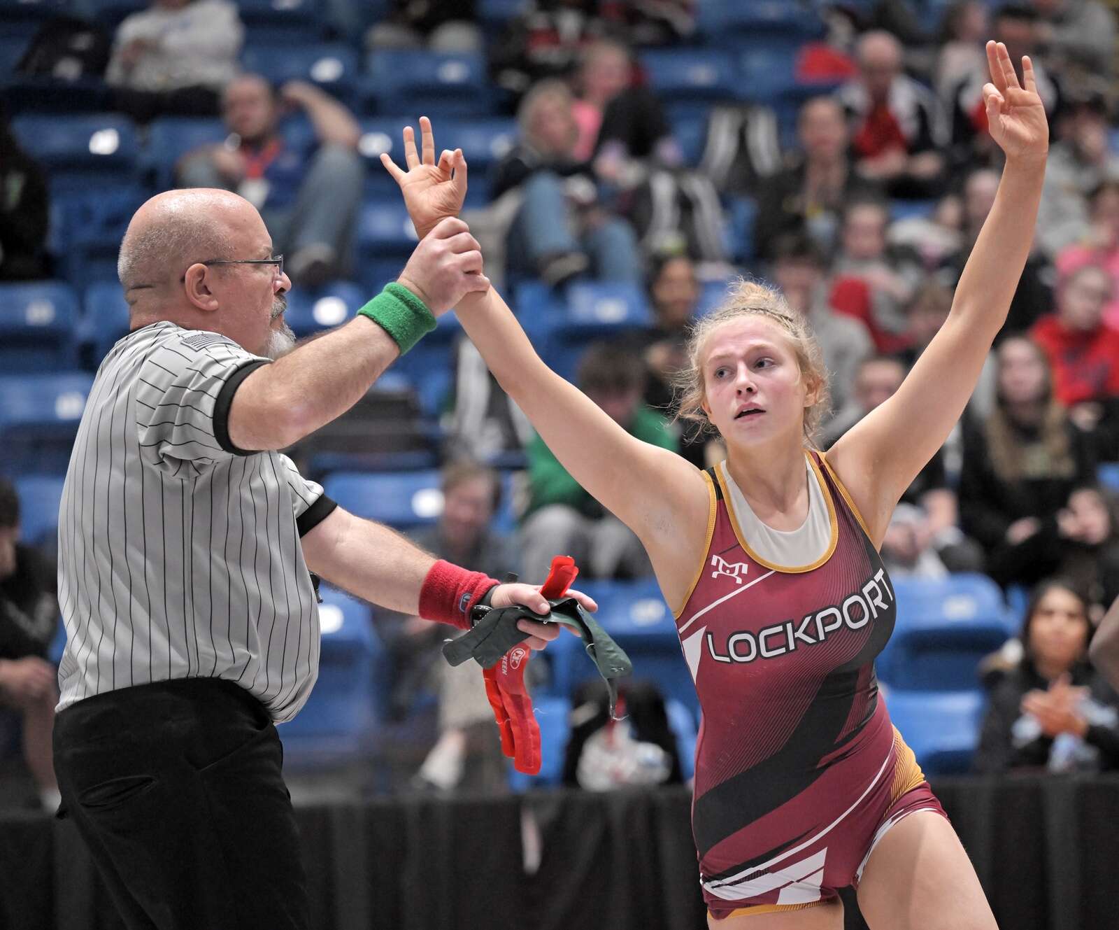 Glenbard East’s Nadiia Shymkiv is declared the winner over Saint Viator’s Charlotte Nold in the 105-pound class at the girls wrestling state finals tournament at Grossinger Arena in Bloomington on Saturday, Feb. 28, 2026.