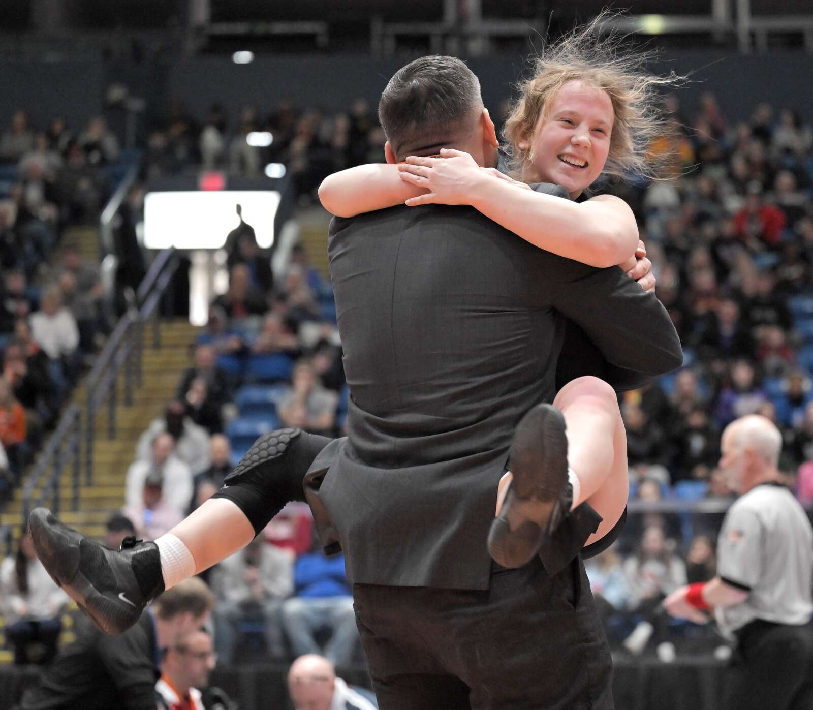 South Elgin’s Allison Garbacz throws her coach Robert Tornabene after winning the 155-pound class at the girls wrestling state finals tournament at Grossinger Arena in Bloomington on Saturday, Feb. 28, 2026.