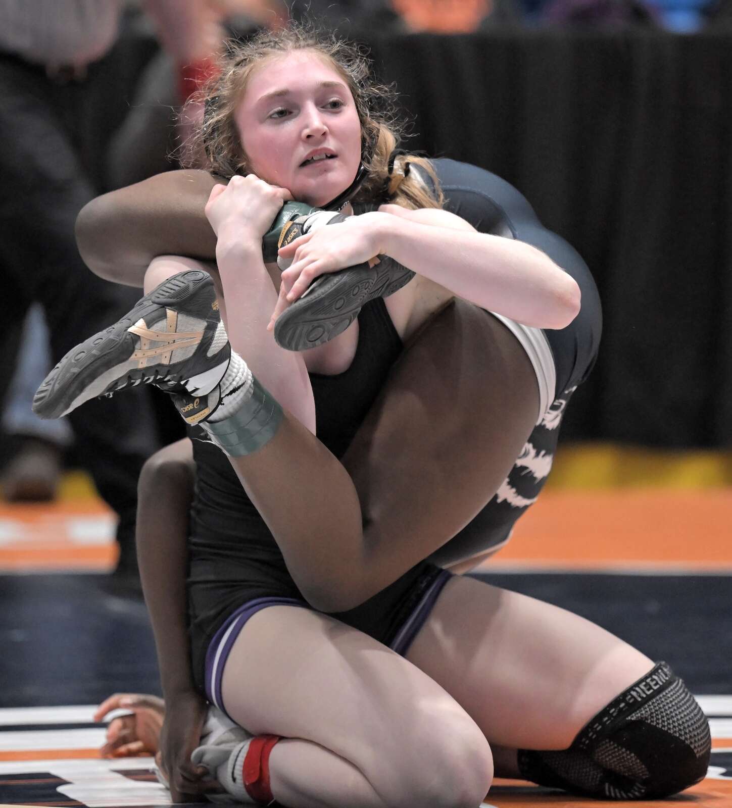 Glenbard East’s Nadiia Shymkiv holds her position against Saint Viator’s Charlotte Nold in the 105-pound class at the girls wrestling state finals tournament at Grossinger Arena in Bloomington on Saturday, Feb. 28, 2026.
