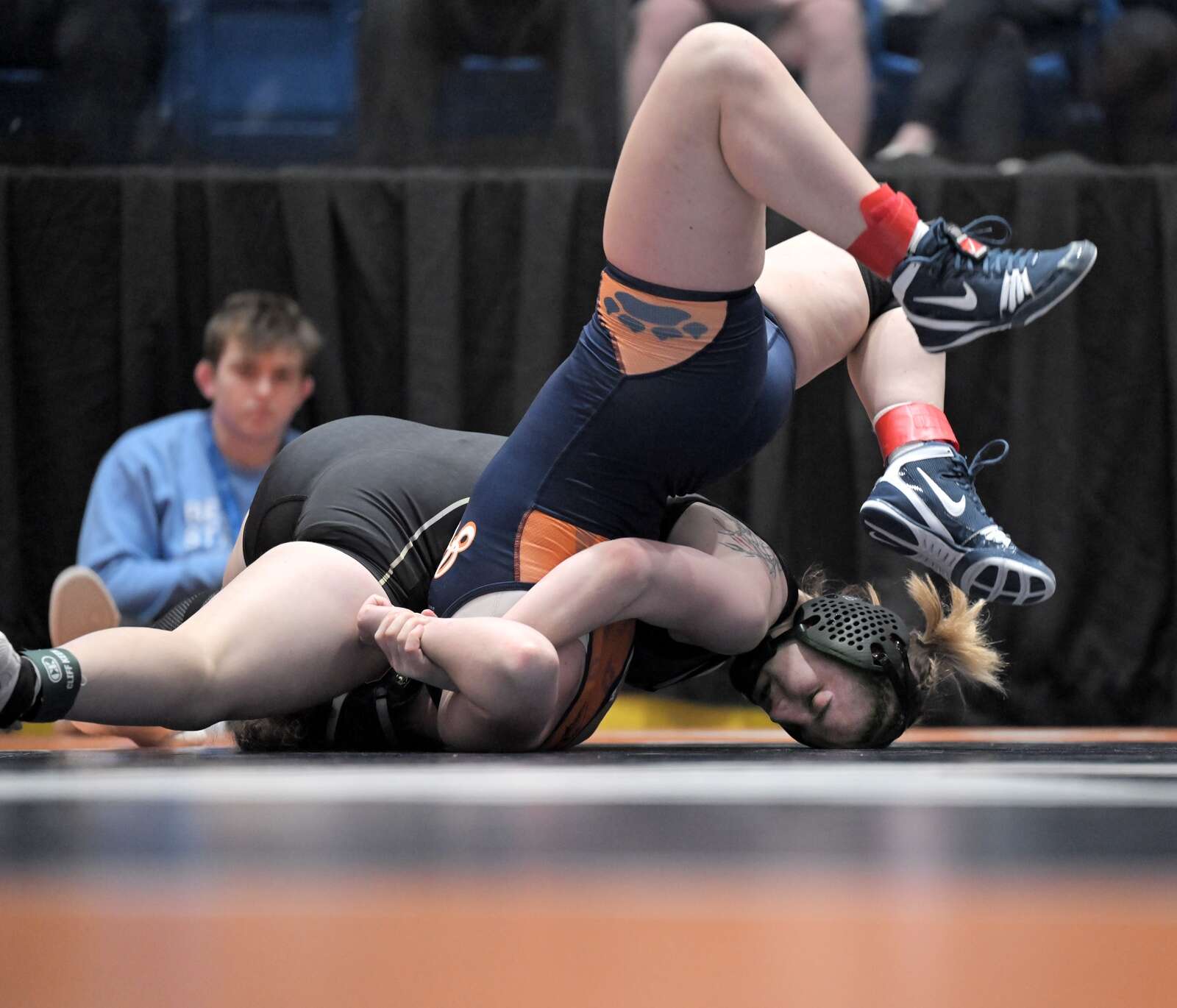Hampshire’s Samantha Diehl struggles with Rock Island’s Sourtney Walls, top, in the 190-pound class at the girls wrestling state finals tournament at Grossinger Arena in Bloomington on Saturday, Feb. 28, 2026.