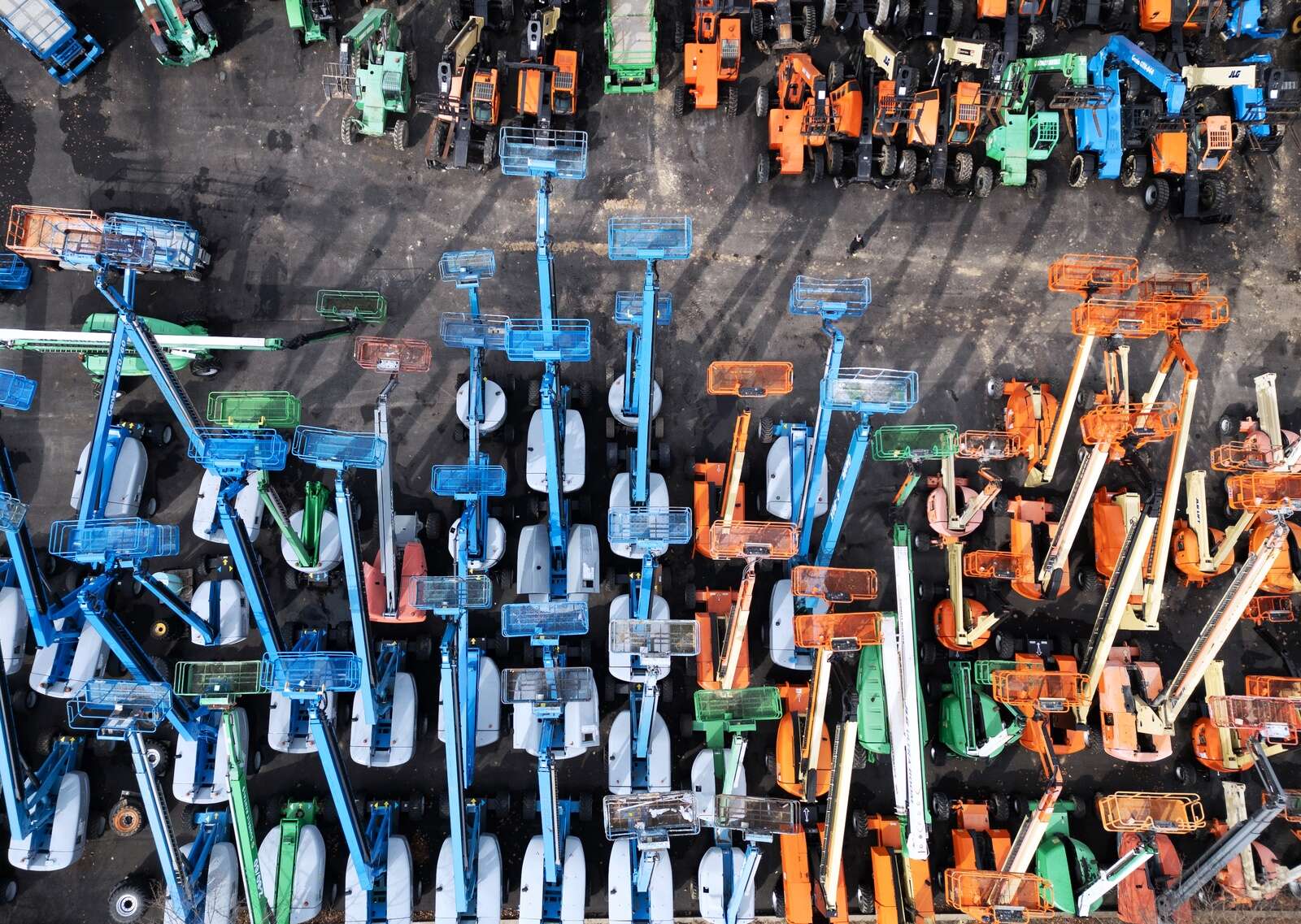 The tiny shadow of a worker is cast in the parking area of industrial equipment, including boom lifts, at Illinois Lift Equipment along Industrial Drive in Cary. The company’s website says they sell new and used forklifts, scissor lifts, boom lifts and provide rentals, service and part sales. The company states more than 1000 used forklifts are in stock.