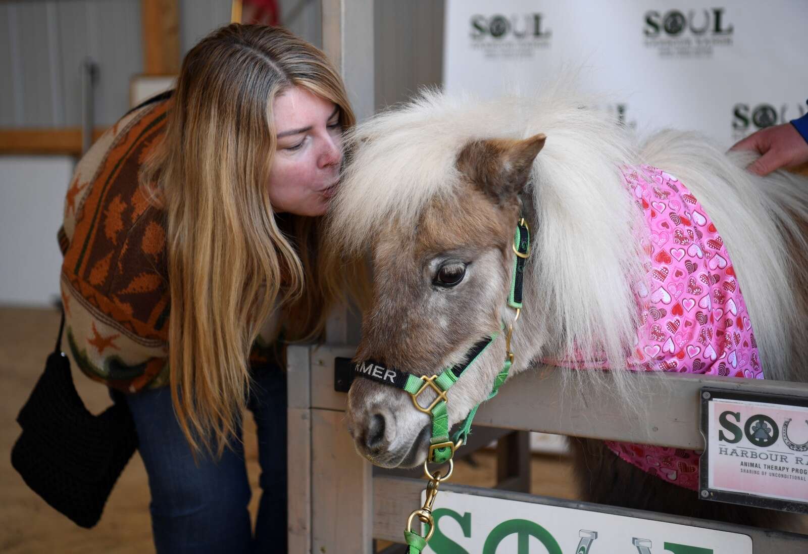 Heather Scott, of Hoffman Estates plants a kiss on a miniature horse named “Charmer” at the kissing booth during the SOUL Kisses 4 Valentine's Day event at SOUL Harbour Ranch on Saturday, Feb. 14, 2026 in Barrington.