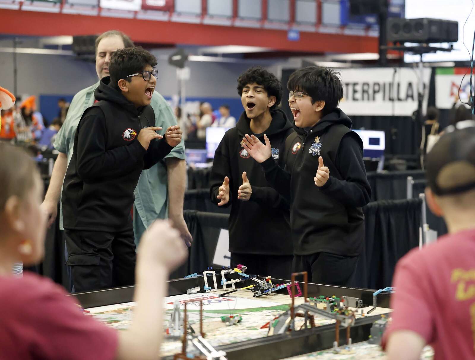 Team Titan of Buffalo Grove, including San Nimballi, from left, Sohan Vemula and Bala Vadhiwani react to their round during the Illinois FIRST LEGO League Challenge State Robotics Championship at Elgin Community College Saturday, Feb. 14, 2026 in Elgin.