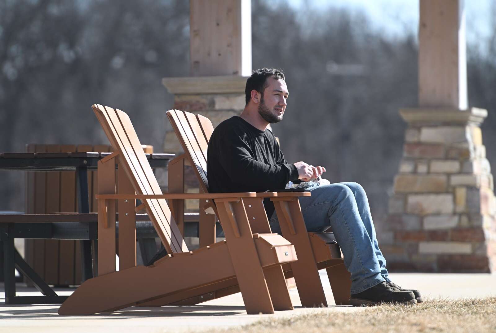Carpentersville resident Austin Eisenhauer enjoys Monday’s nice weather with lunch and a lake view at Rotary Park on Klasen Road in Cary. Eisenhauer, who was on break from his Crystal Lake job, also took a walk on the park’s trails after eating.