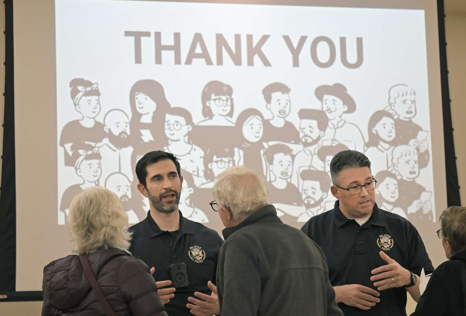 Deputy Chief David Bradnwein, left, and Chief William Nord talk with residents at a Community Resource & Services Forum at Falcon Park on Hicks Rd. in Palatine on Thursday, Feb. 12, 2026.