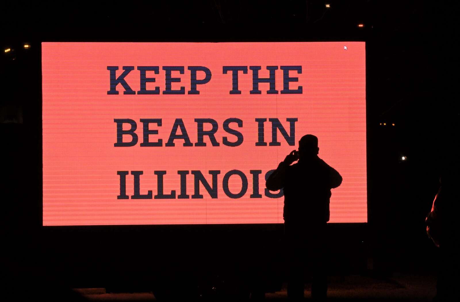 A man takes a photo of a video board outside at a public gathering to show support for tax break legislation that could bring the Chicago Bears to Arlington Heights, on Wednesday, Feb, 11, 2026 at the DoulbleTree Arlington Heights on Algonquin Rd.