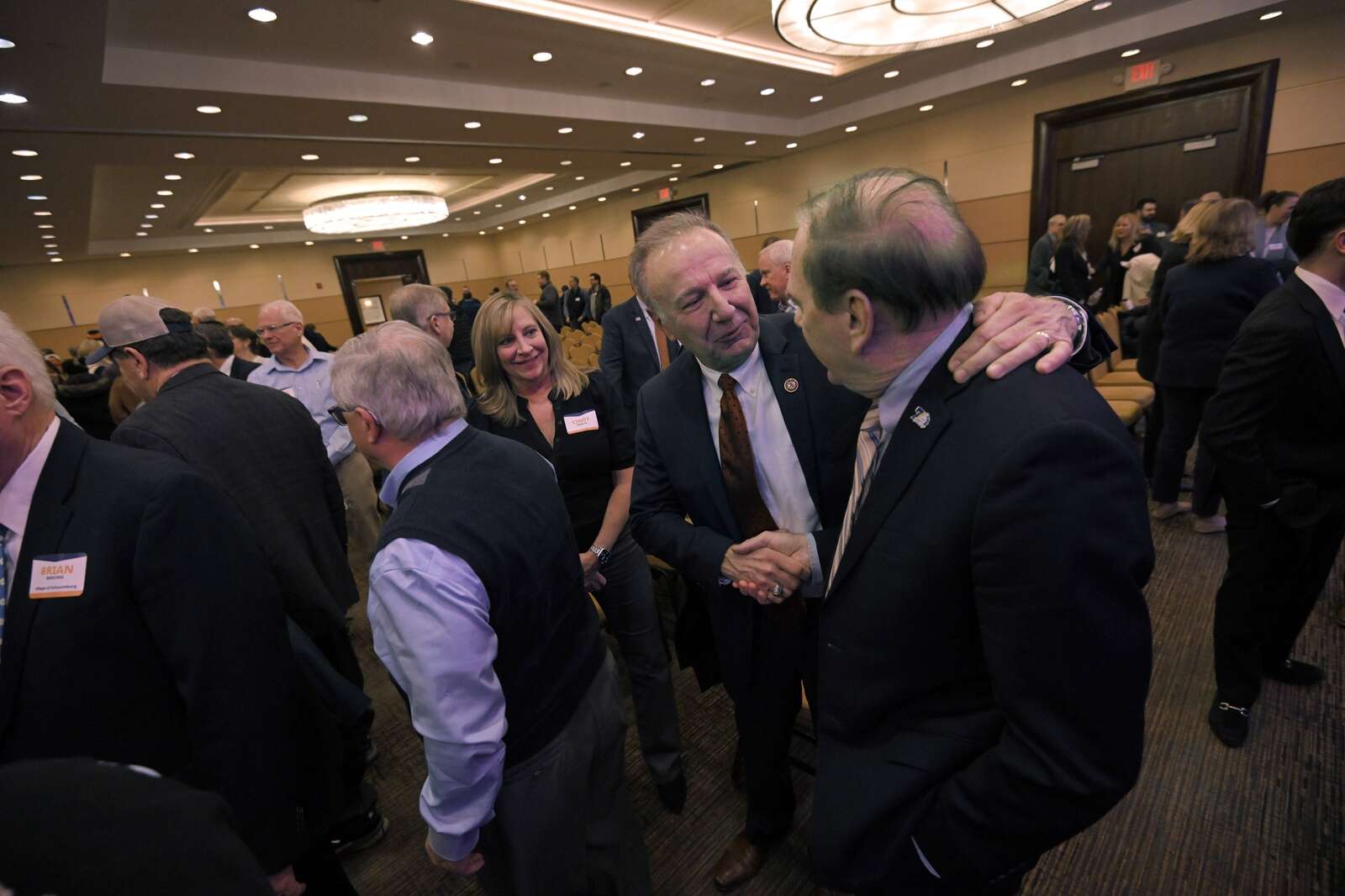 Arlington Heights Mayor Jim Tinaglia shakes hands with Schaumburg Mayor Tom Dailly at a public gathering to show support for tax break legislation that could bring the Chicago Bears to Arlington Heights, on Wednesday, Feb, 11, 2026 at the DoubleTree Arlington Heights hotel.