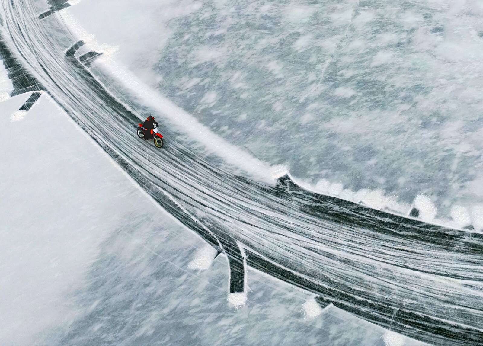 A person gracefully slides or drifts around a corner riding an "ice motorcycle" on a small frozen pond Wednesday, Jan. 21, 2026 in Mount Prospect. According to American Motorcyclist riding a motorcycle on ice seems like it would be impossible, but after you add a few-hundred traction screws to the front and rear tires, you’ll experience traction levels as good as the best dirt or even asphalt tracks. Racers compete on plowed courses that are either oval-style, like a flat track, or grand-prix style with right and left turns of all shapes and sizes.