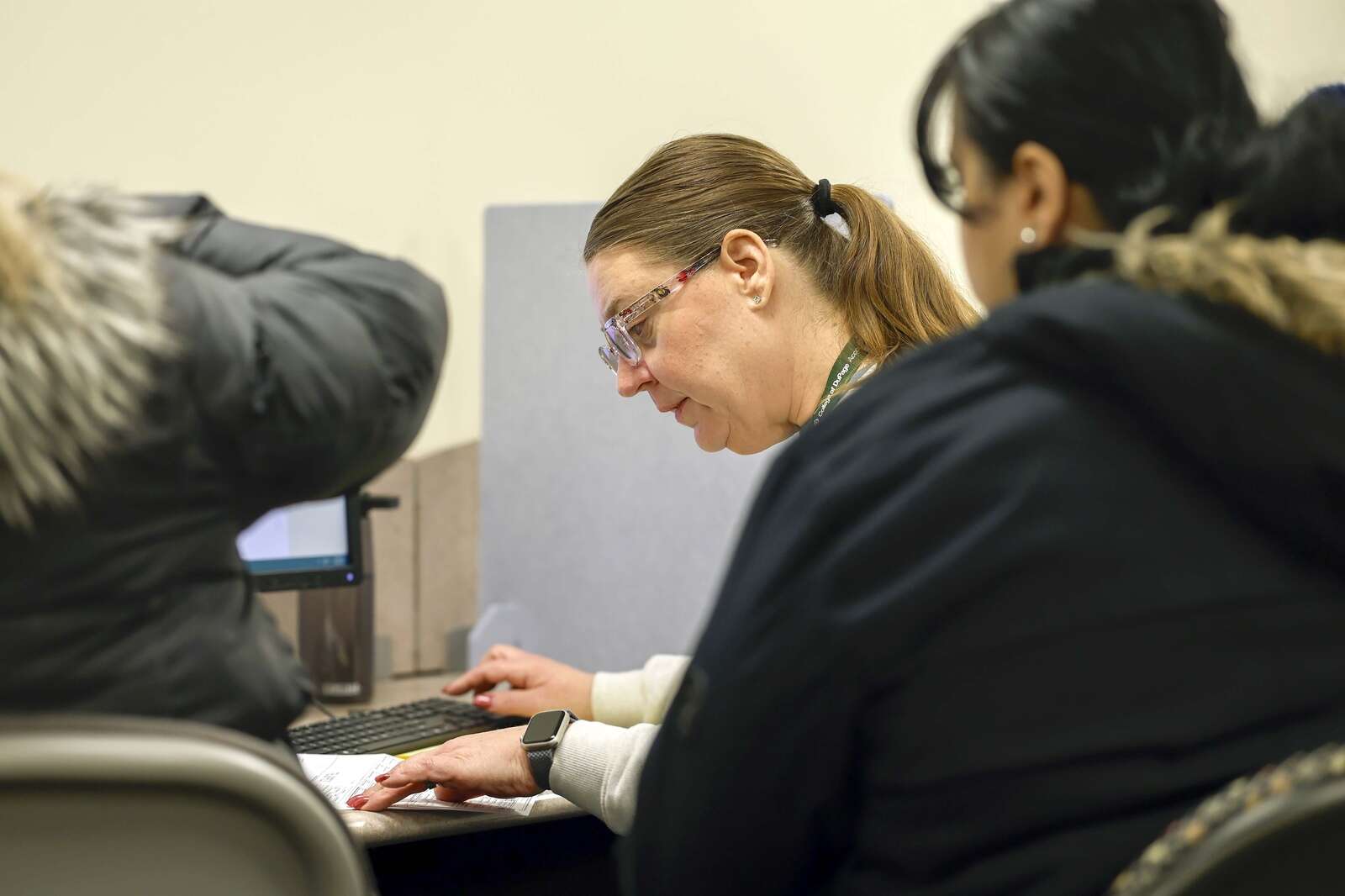 Robin Kastengren helps a couple with their taxes during a free tax clinic at College of DuPage Student Resource Center in Glen Ellyn. Brian Hill/bhill@dailyherald.com