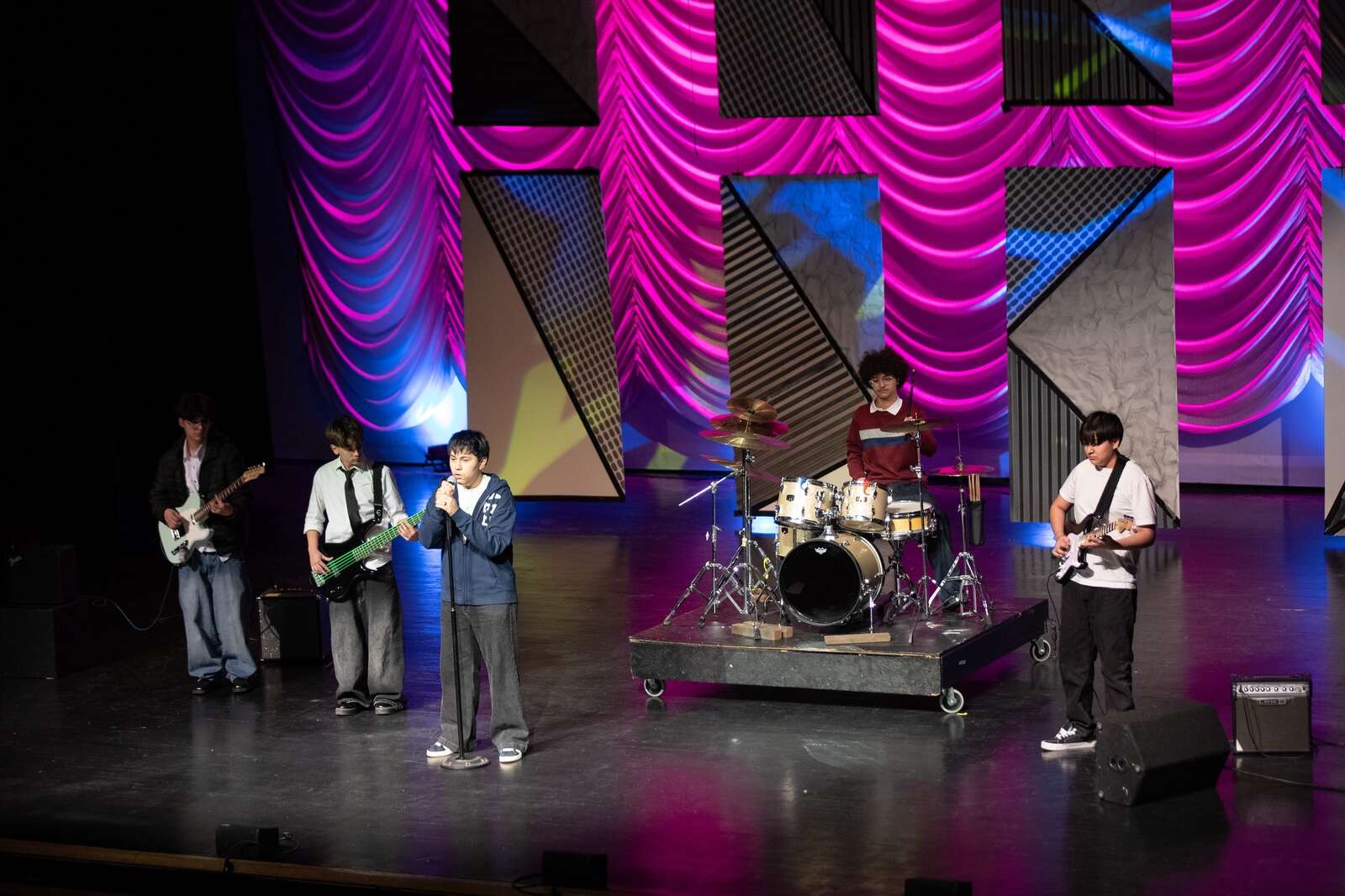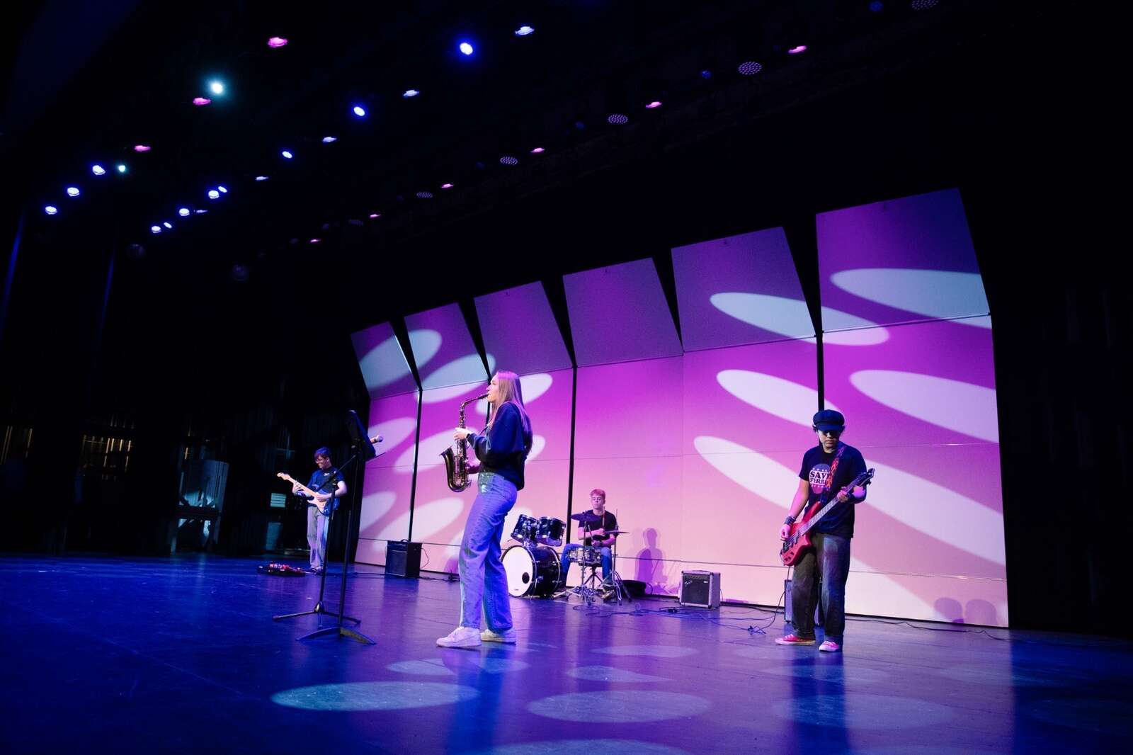The band Haphazard, with James Griffin on guitar, Andrew Llamas on bass, Neda Bazys on saxophone and Michael Nowakowski on drums, perform Lynyrd Skynyrd’s “Sweet Home Alabama” during the Bartlett Talent Show on Feb. 18. Haphazard will represent the school at the 2026 U-46 TalentFest March 10. Courtesy of John Konstantaras