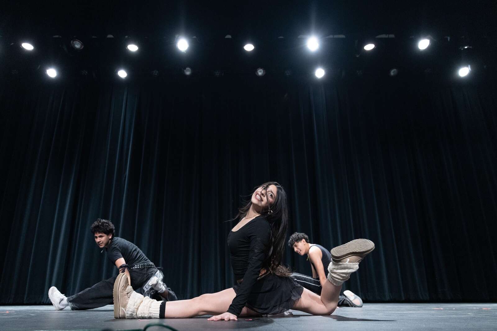 Seniors Ariana Lopez, Oscar Villatoro and Adrian Rivera, aka A.O.A., perform “Gnarly” and “Debut” by Katseye at the Elgin High School talent show Feb. 4. A.O.A. finished in second place at the show and qualified for the U-46 TalentFest. Courtesy of John Konstantaras