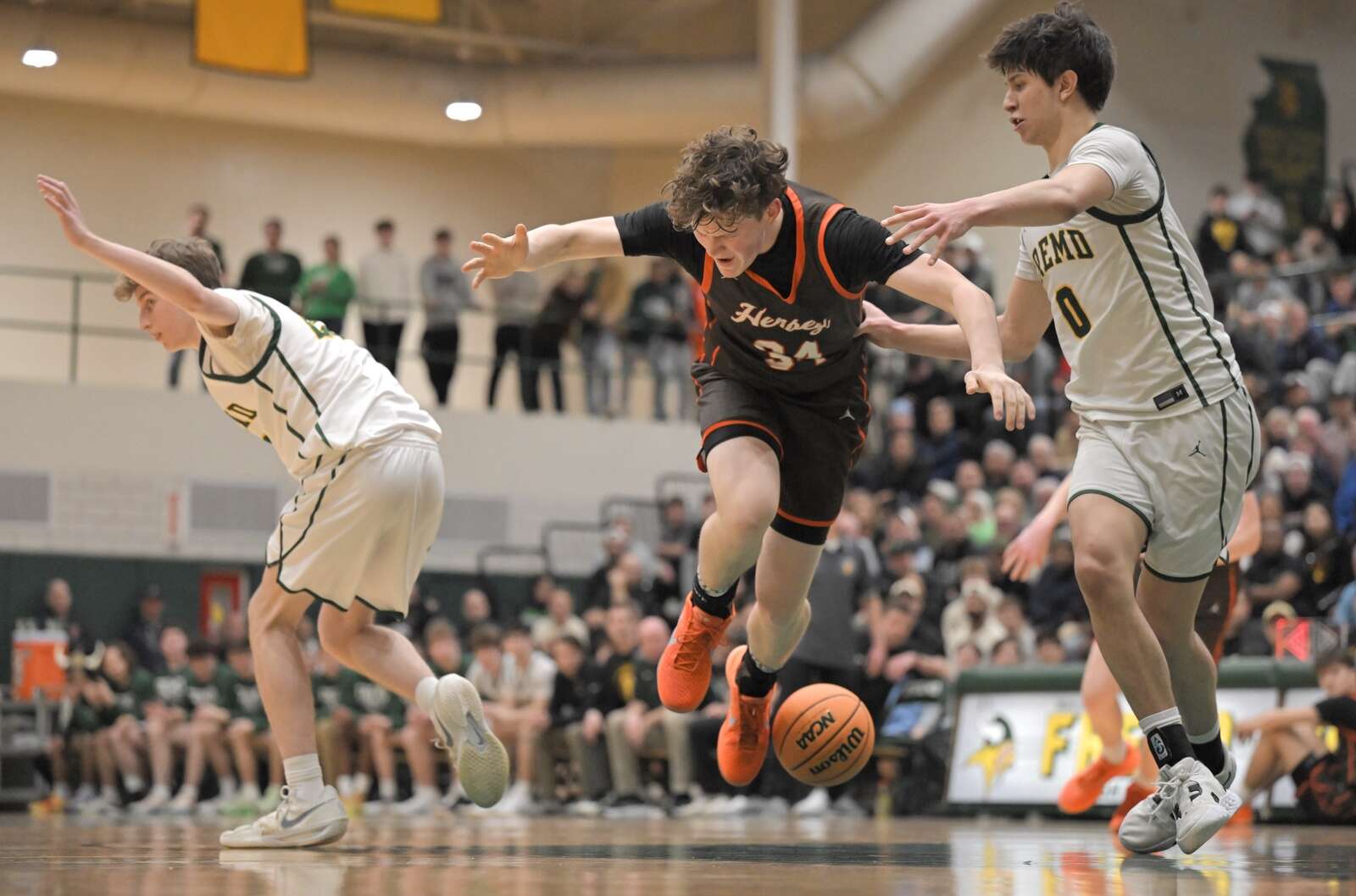 With 9.7 seconds left in the first overtime and Fremd leading by 3, Hersey had the ball but turned it over. Fremd then was called for a charge on the ensuing inbounds play, giving the ball back to Hersey.