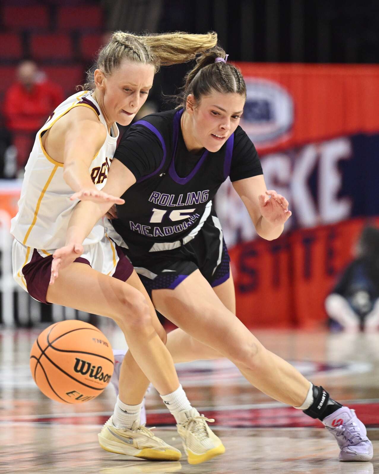 Loyola's Emily Naraky left, steals the ball from Rolling Meadows' Abby Ramel during the semifinals of the IHSA Class 4A girls state basketball tournament at CEFCU Arena on Friday, March 6, 2026 in Normal. Joe Lewnard/jlewnard@dailyherald.com