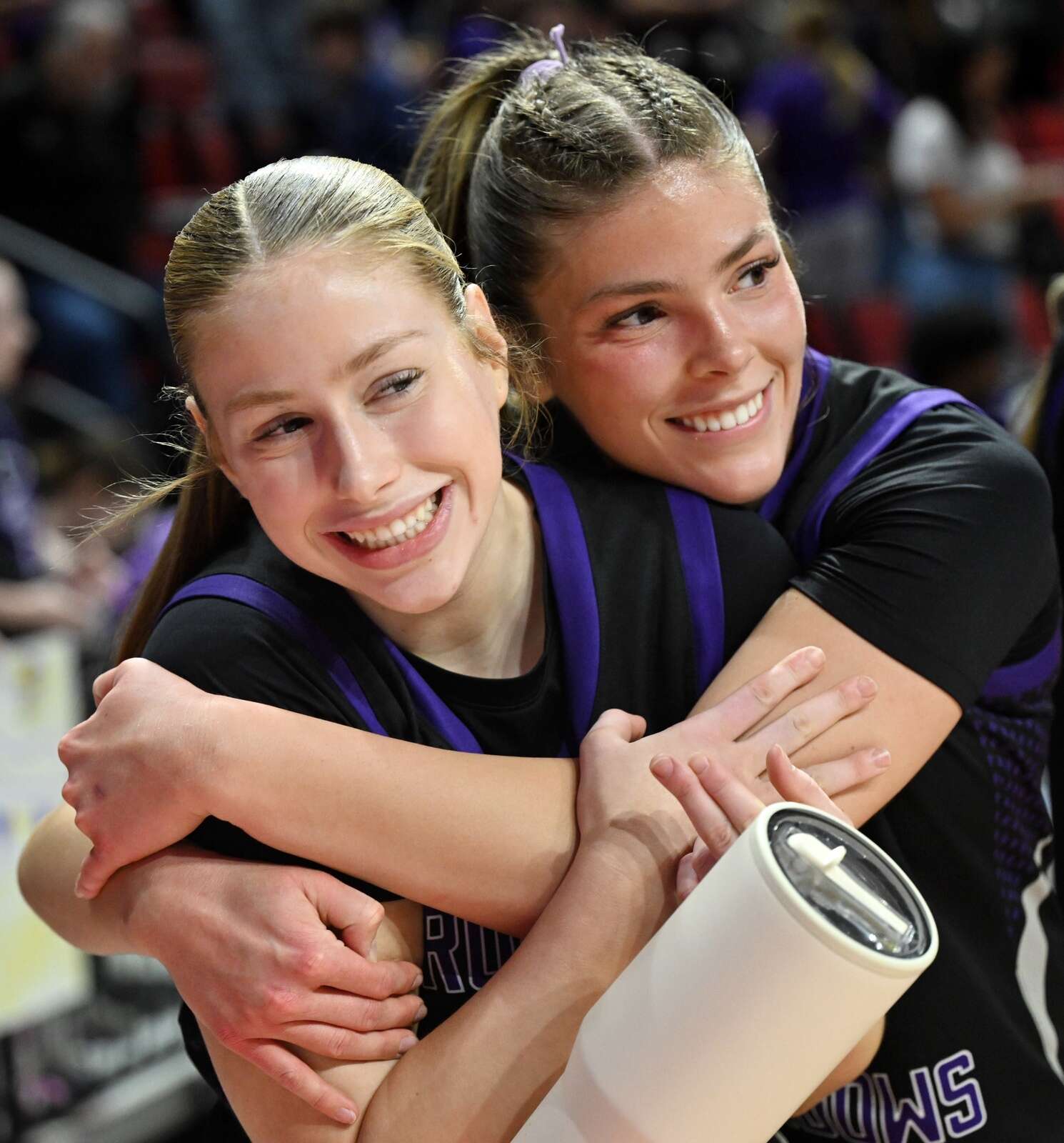 Rolling Meadows' Abby Ramel, right, hugs her sister Taylor following the Mustangs’ 46-33 loss to Loyola Academy in the semifinals of the IHSA Class 4A girls state basketball tournament at CEFCU Arena on Friday, March 6, 2026 in Normal. Joe Lewnard/jlewnard@dailyherald.com
