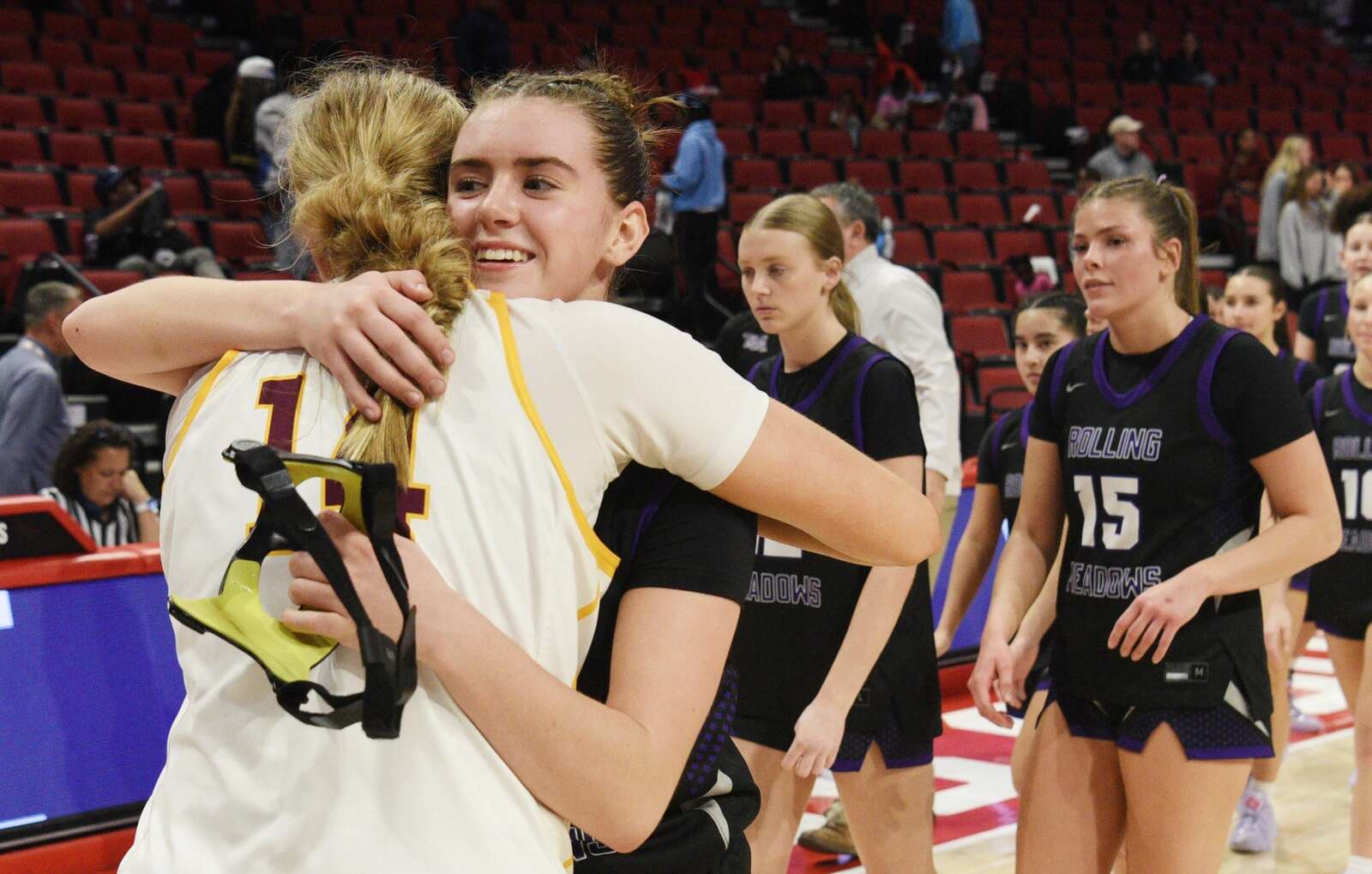 Rolling Meadows' Nellie Osterhues, right, hugs Loyola's Emily Naraky following the Mustangs’ 46-33 loss to the Ramblers during the semifinals of the IHSA Class 4A girls state basketball tournament at CEFCU Arena on Friday, March 6, 2026 in Normal. Joe Lewnard/jlewnard@dailyherald.com
