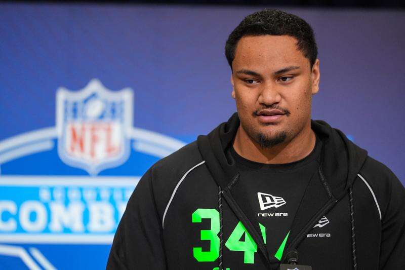Miami offensive lineman Francis Mauigoa (34) speaks during a press conference at the NFL football scouting combine in Indianapolis, Saturday, Feb. 28, 2026. (AP Photo/Michael Conroy) (AP Photo/Michael Conroy)