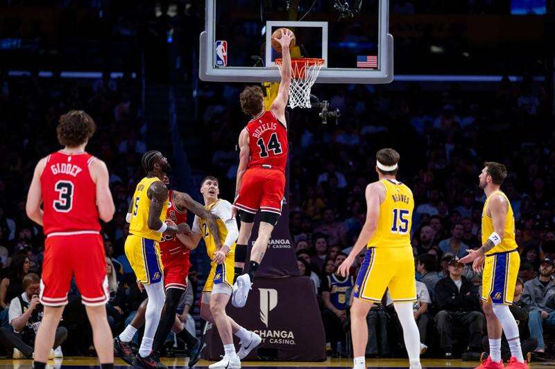 Chicago Bulls forward Matas Buzelis (14) dunks against the Los Angeles Lakers during the first half of an NBA basketball game against the Chicago Bulls, Thursday, March 12, 2026, in Los Angeles. (AP Photo/Ethan Swope) (AP Photo/Ethan Swope)