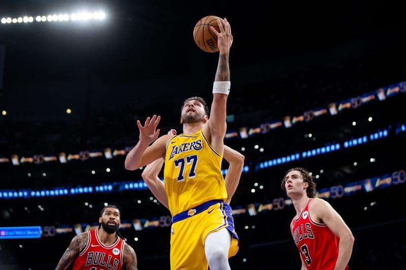 Los Angeles Lakers guard Luka Doncic (77) goes to the basket against the Chicago Bulls during the first half of an NBA basketball game against the Chicago Bulls, Thursday, March 12, 2026, in Los Angeles. (AP Photo/Ethan Swope) (AP Photo/Ethan Swope)