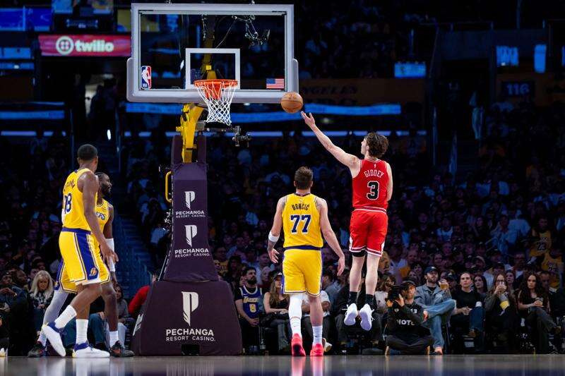 Chicago Bulls guard Josh Giddey (3) goes to the basket against the Los Angeles Lakers during the first half of an NBA basketball game, Thursday, March 12, 2026, in Los Angeles. (AP Photo/Ethan Swope) (AP Photo/Ethan Swope)