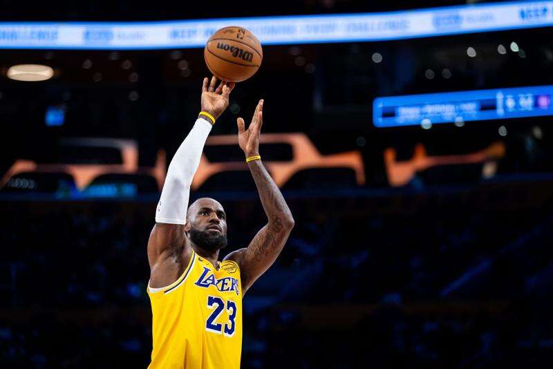 Los Angeles Lakers forward LeBron James shoots a free throw during the first half of an NBA basketball game against the Chicago Bulls, Thursday, March 12, 2026, in Los Angeles. (AP Photo/Ethan Swope) (AP Photo/Ethan Swope)