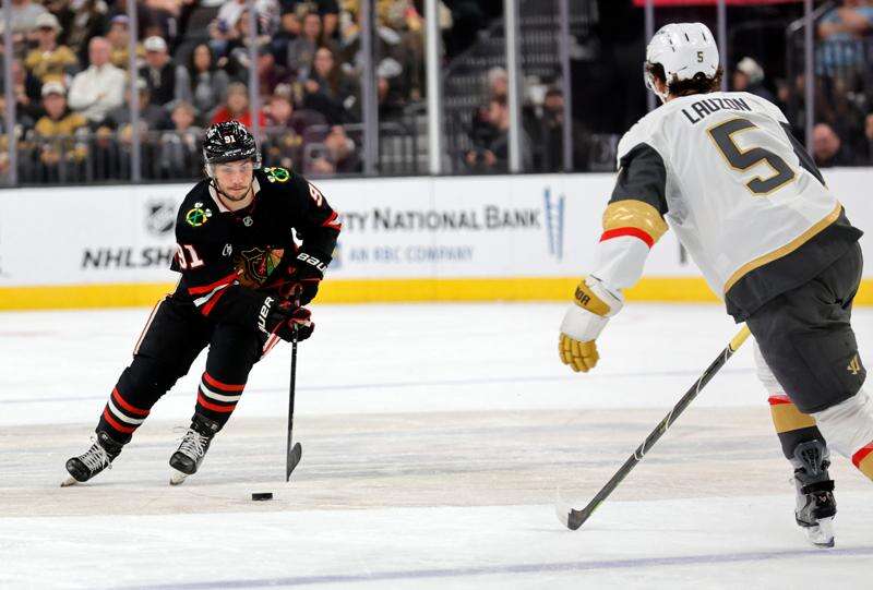 Chicago Blackhawks center Frank Nazar (91) skates against Vegas Golden Knights defenseman Jeremy Lauzon (5) during the first period of an NHL hockey game Saturday, March 14, 2026, in Las Vegas. (AP Photo/Steve Marcus) (AP Photo/Steve Marcus)