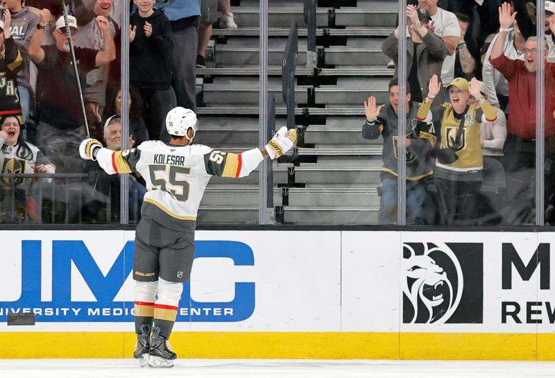 Rasmus Andersson and Keegan Kolesar also scored goals for the Golden Knights, and Mark Stone and Mitch Marner each had two assists. Jack Eichel, playing in his 300th Golden Knights game, had his three-game goal streak end.