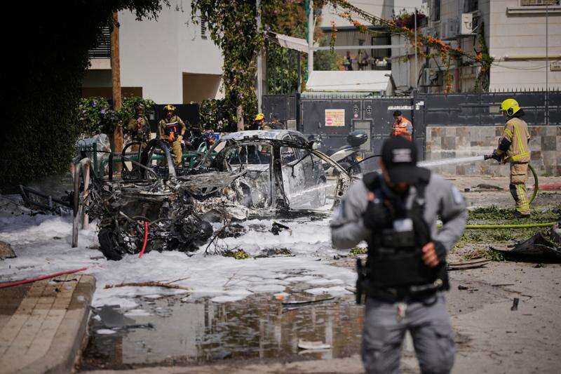 Strikes in the Tel Aviv region caused damage at 23 sites and sparked a small fire Sunday.