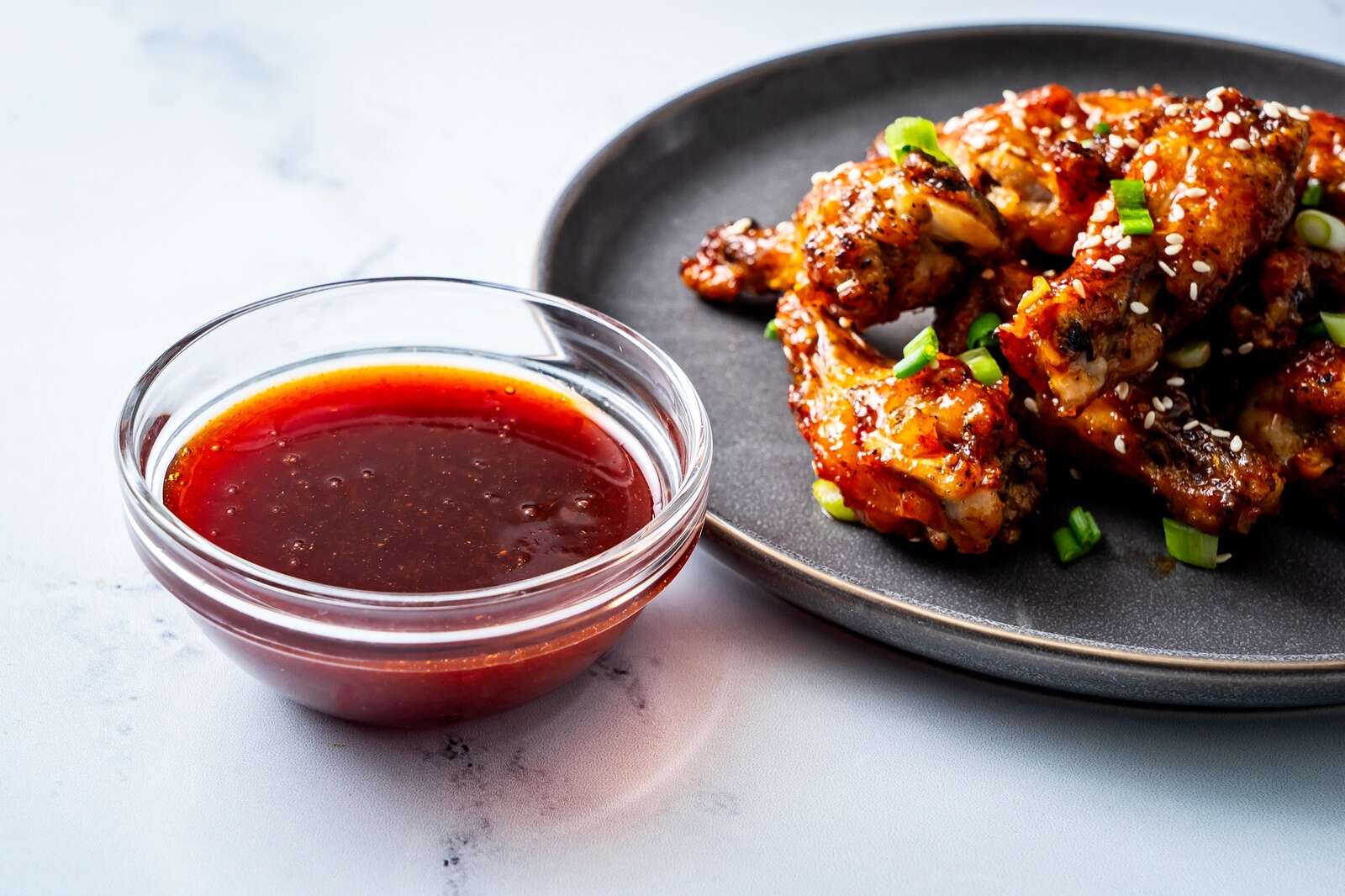 Gochujang-honey sauce. This Korean-style sauce stars gochujang, a fermented pepper paste that’s fairly mild, savory and subtly sweet. (It’s a favorite condiment of mine.) Honey and brown sugar help bring the sauce squarely into the sweet category, while soy sauce, garlic and ginger provide added complexity and dimension. Wings tossed in this sauce will leave you with sticky fingers that you’ll be more than happy to lick clean.