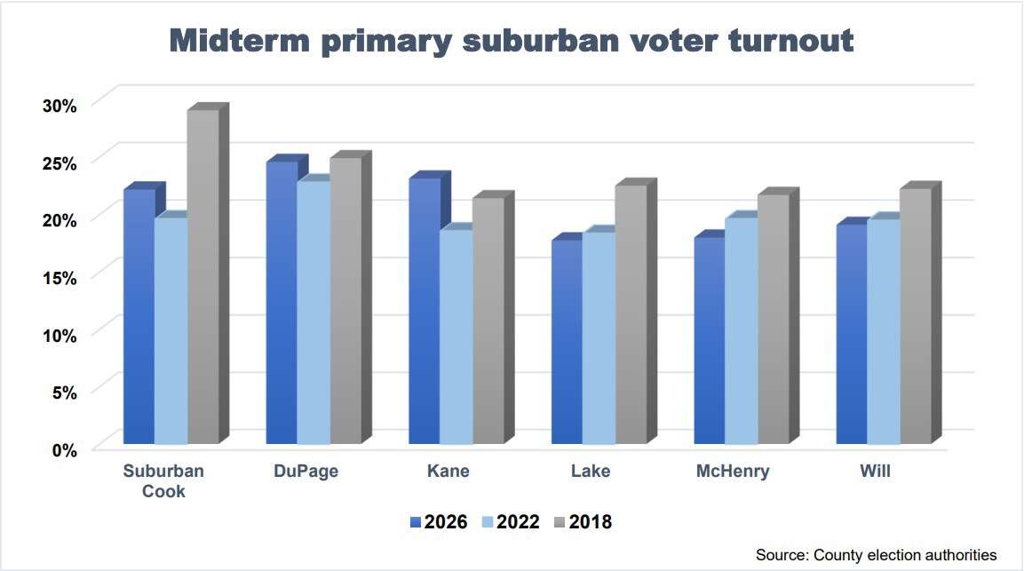 Voter turnout Tuesday was greater than 2022’s midterm primary in suburban Cook, DuPage and Kane counties, but lower than four years ago in Lake, McHenry and Will counties.
